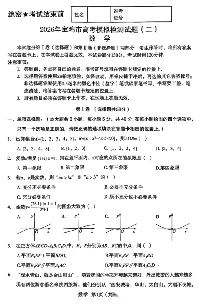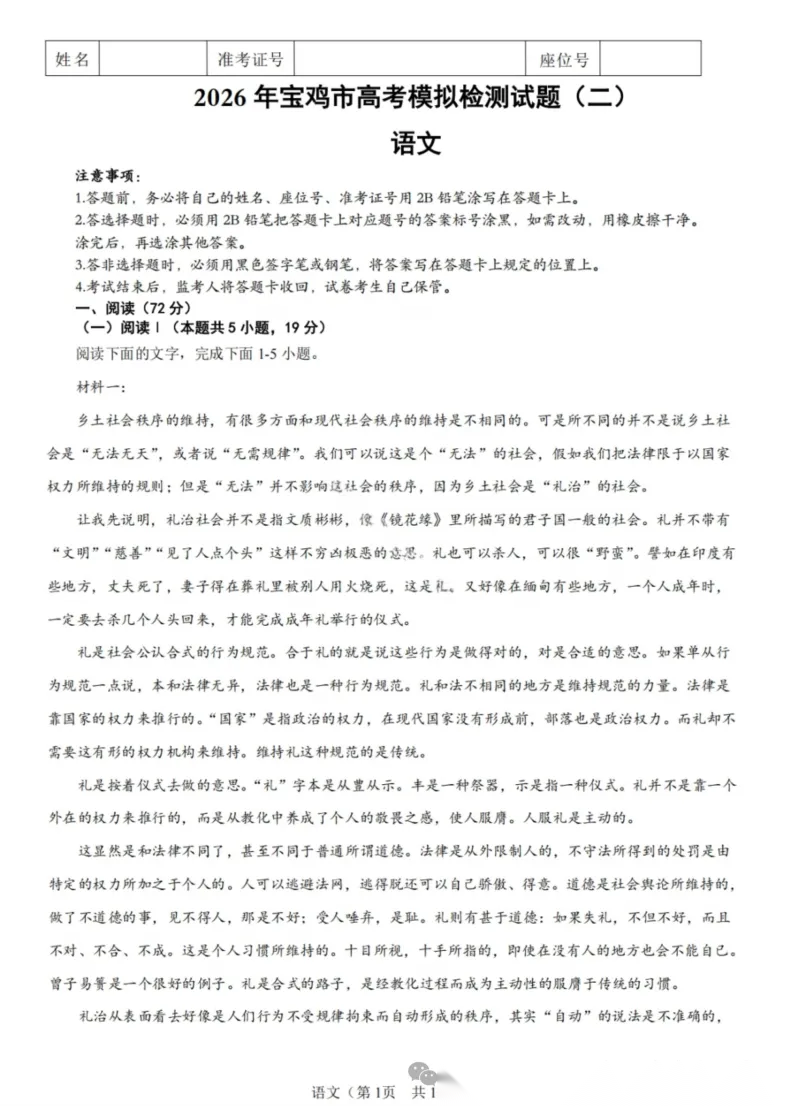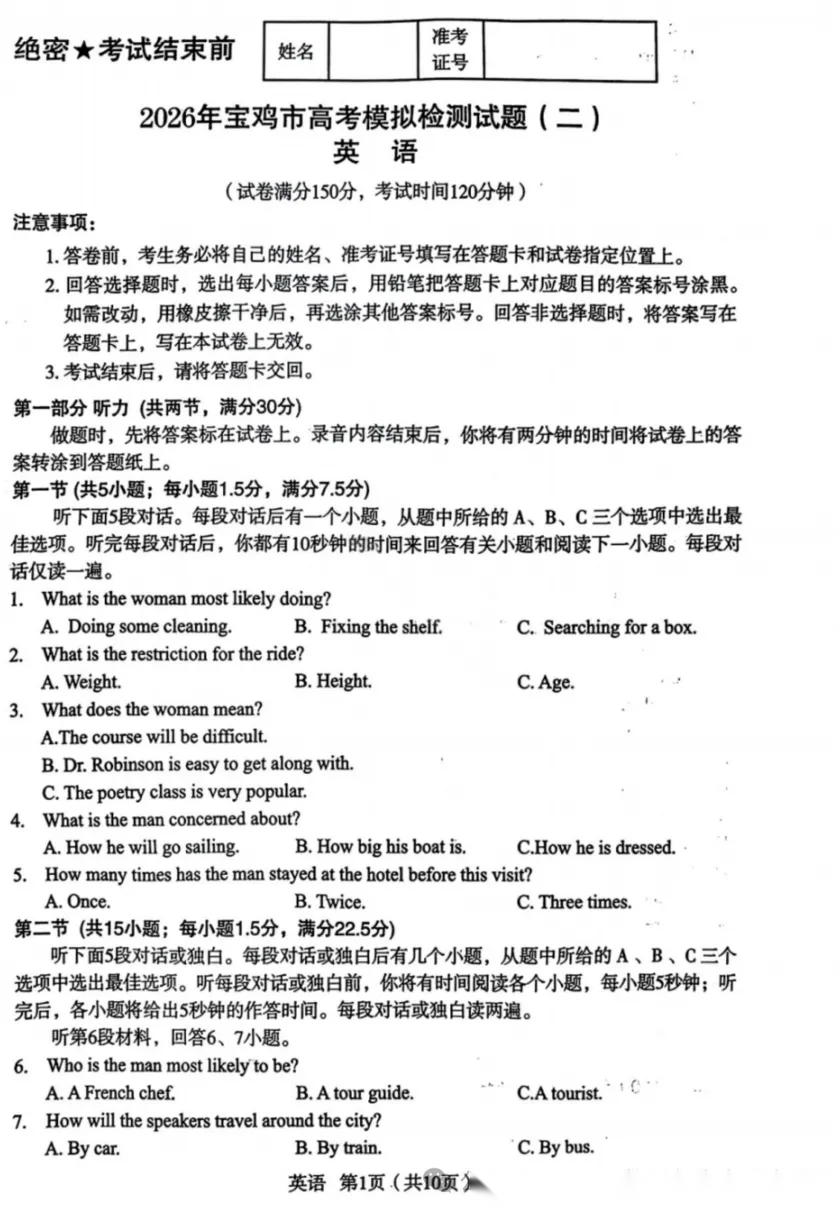 【补齐重发】【西北卷】【陕西卷】陕西省2026年宝鸡市高考模拟检测考试(二)(宝鸡二模)(3.21-3.22) 全科试题卷+答案