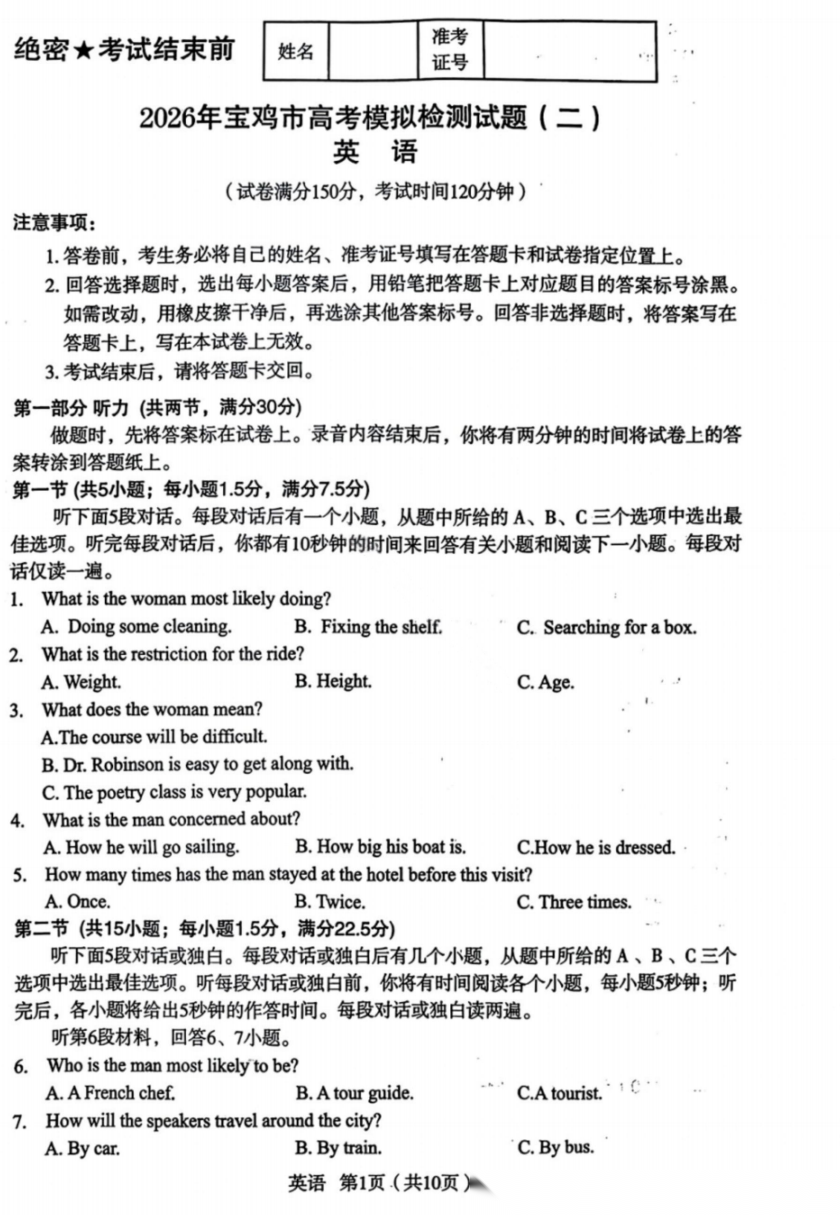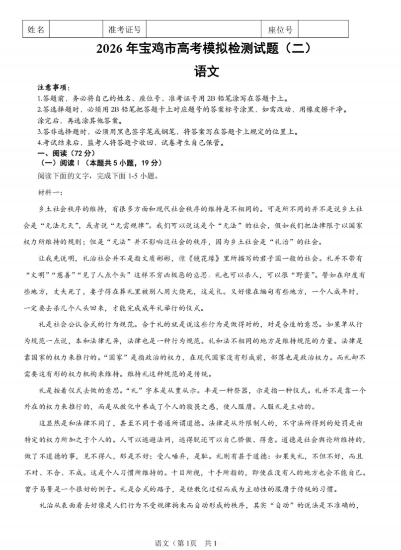 【补齐重发】【西北卷】【陕西卷】陕西省2026年宝鸡市高考模拟检测考试(二)(宝鸡二模)(3.21-3.22) 全科试题卷+答案 【补齐重发】【西北卷】【陕西卷】陕西省2026年宝鸡市高考模拟检测考试(二)(宝鸡二模)(3.21-3.22) 全科试题...