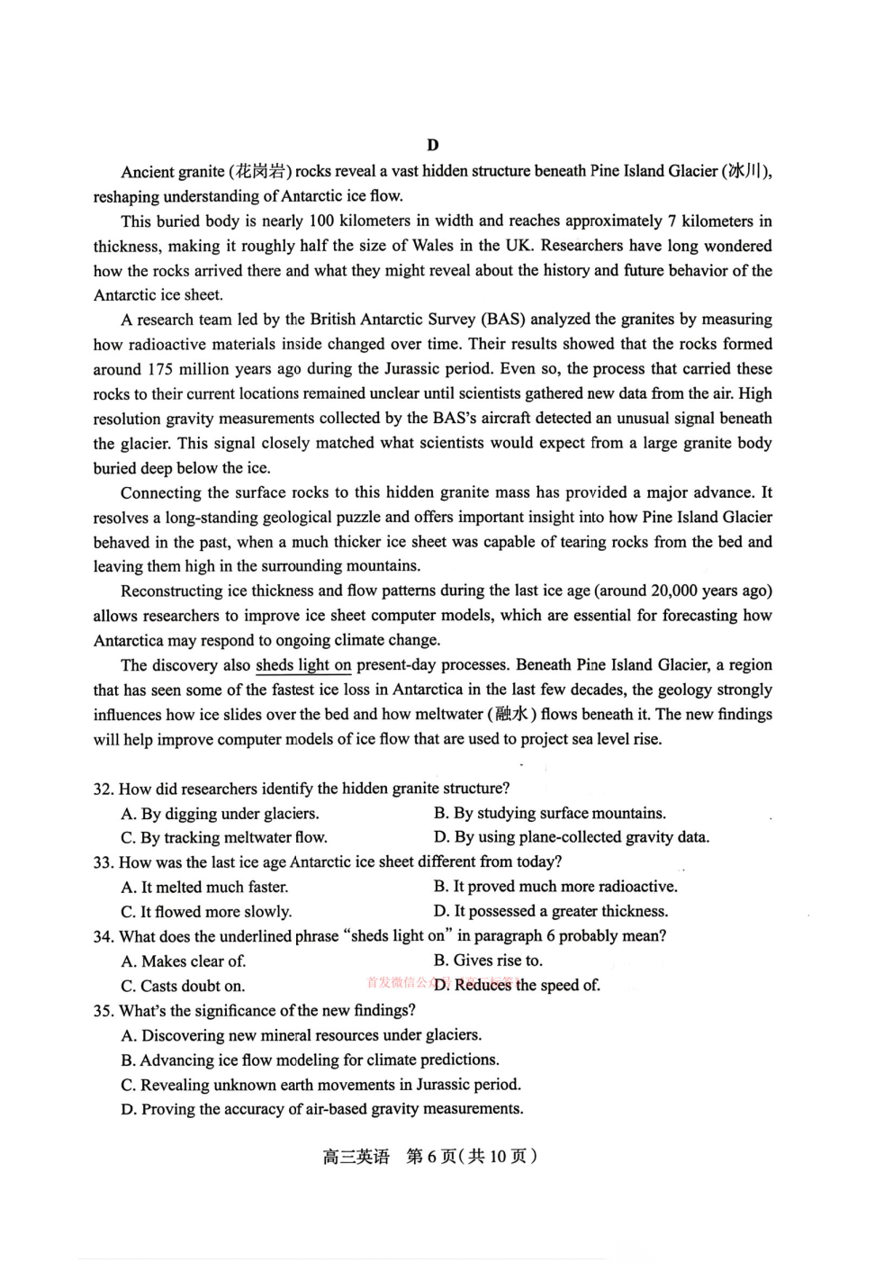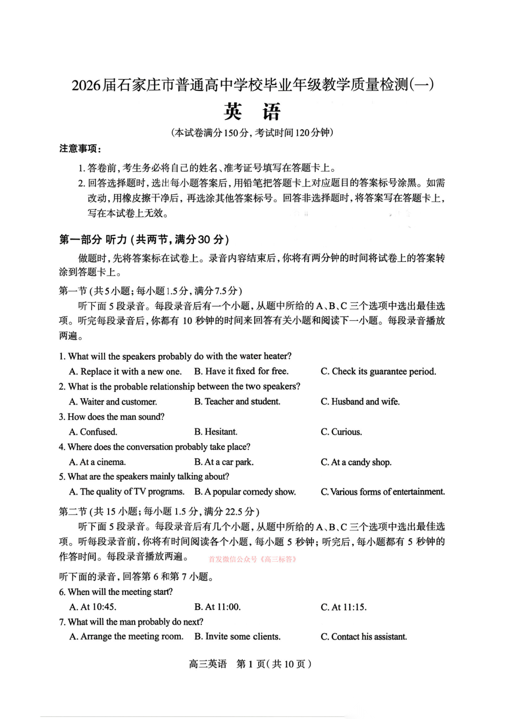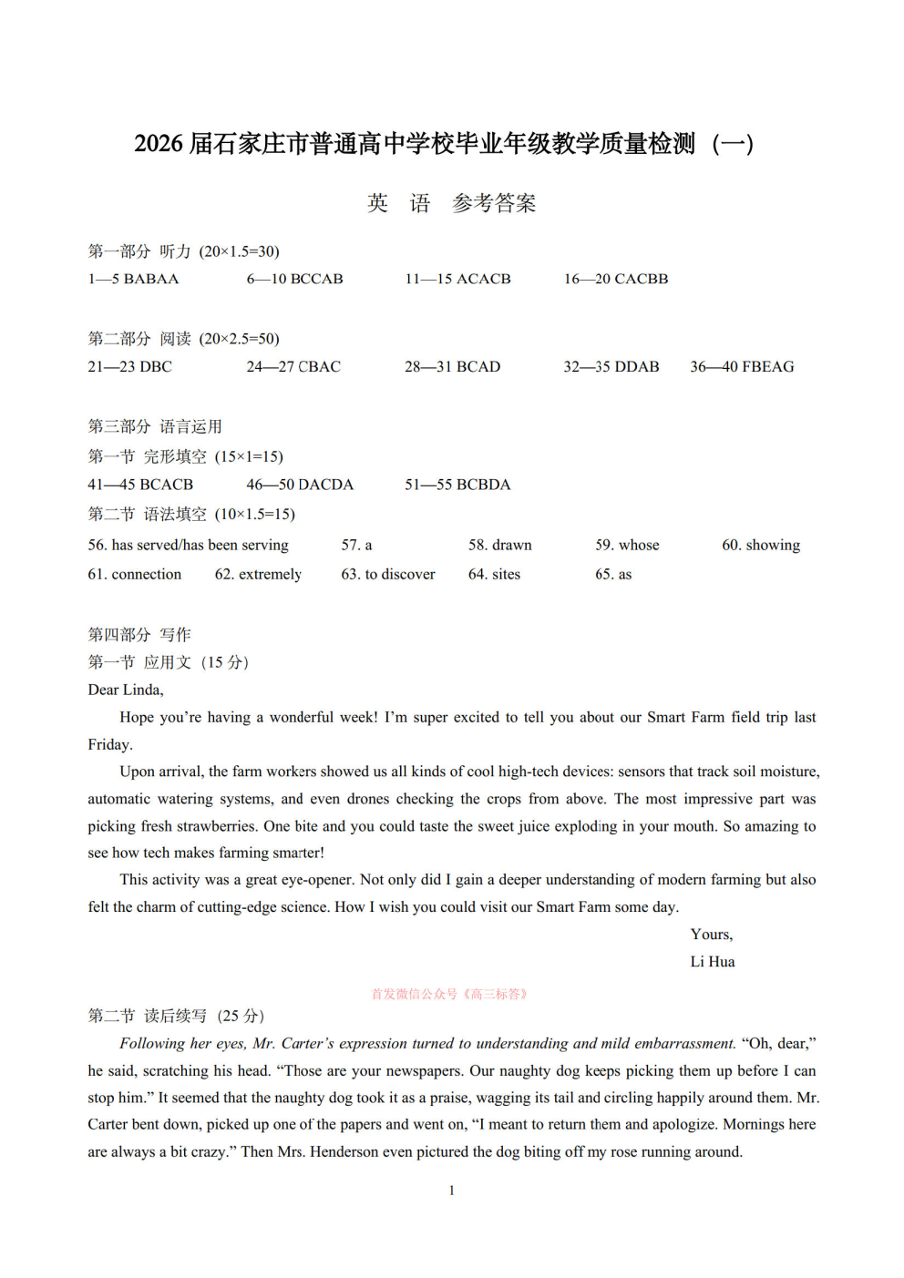 2026石家庄一模语数英语、物理、历史答案