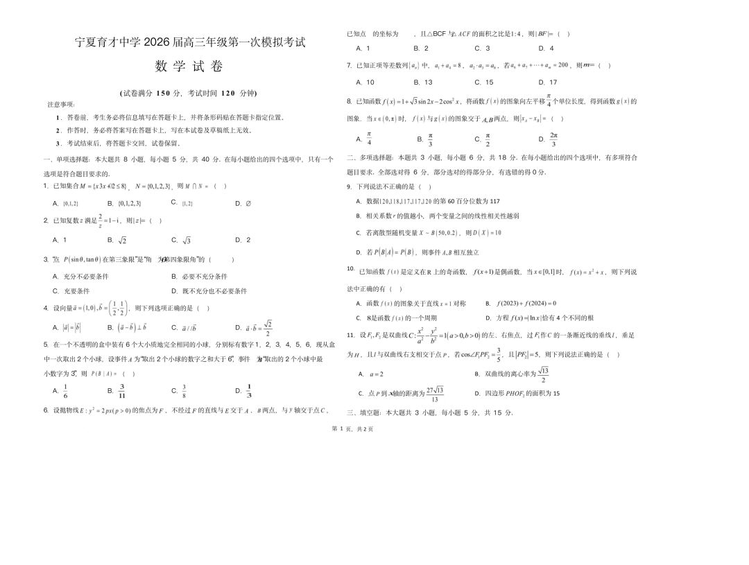 宁夏育才中学2026 届高三下学期3月一模考试
