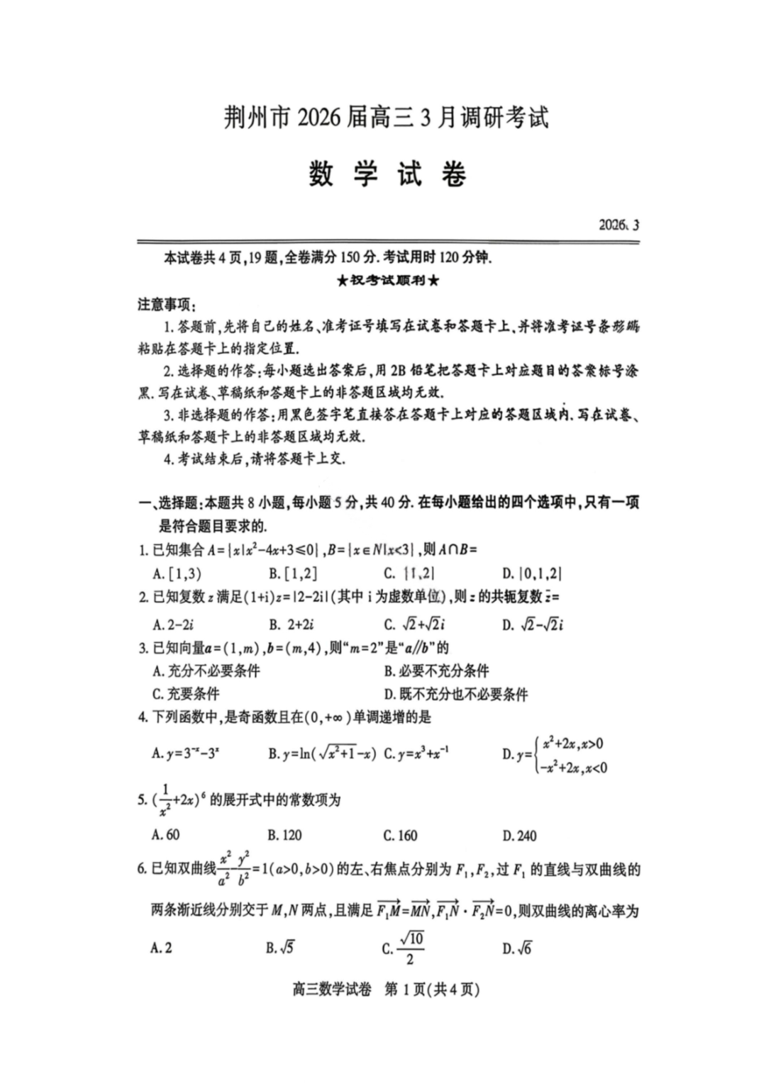 湖北省荆州市2026届高三3月调研考试