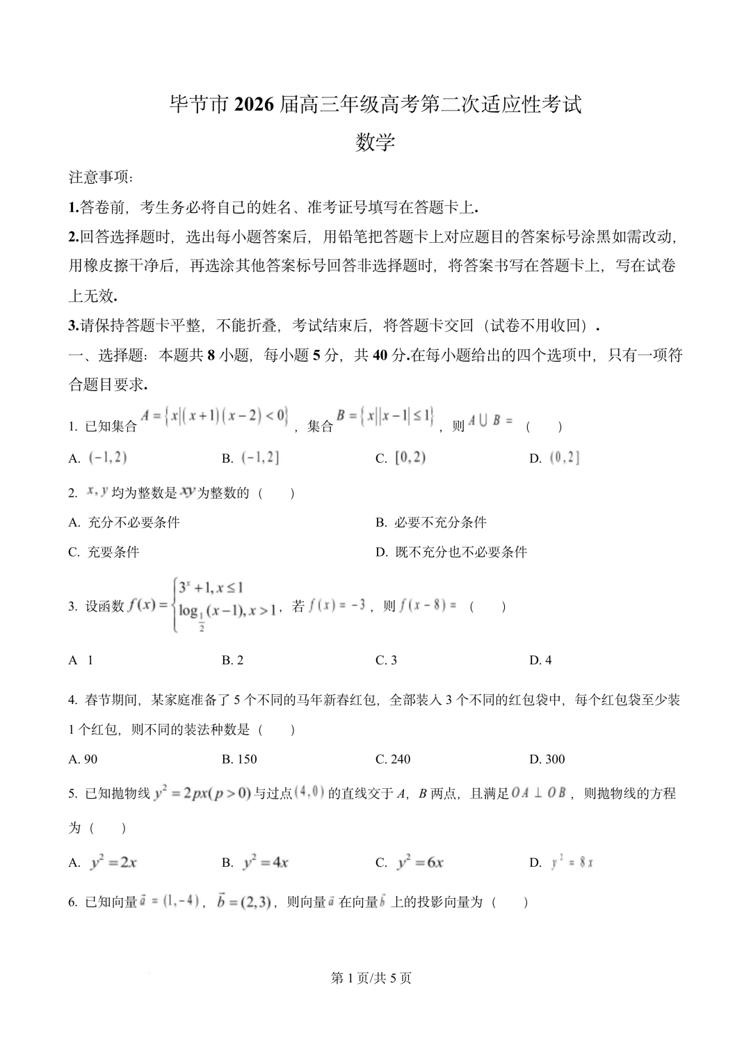 贵州省毕节市2026届高三下学期高考第二次适应性考试(毕节二诊)
