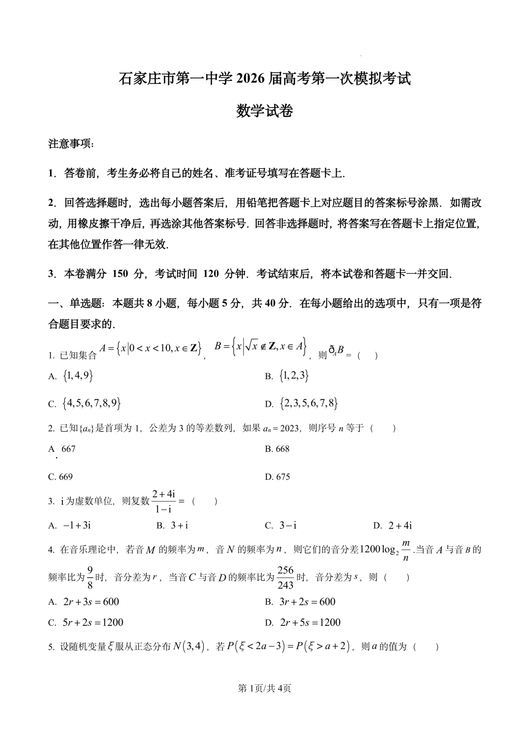 河北石家庄市第一中学2026届高三高考第一次模拟考试