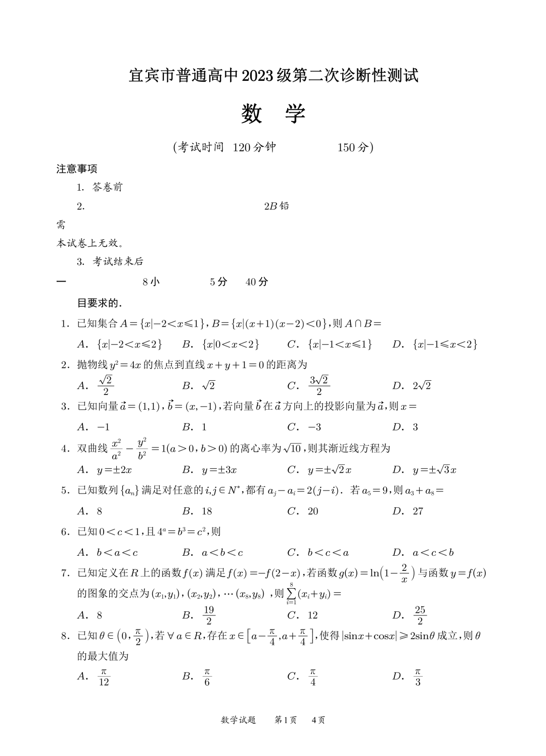 四川省宜宾市普通高中2023级第二次诊断性测试(宜宾二诊)