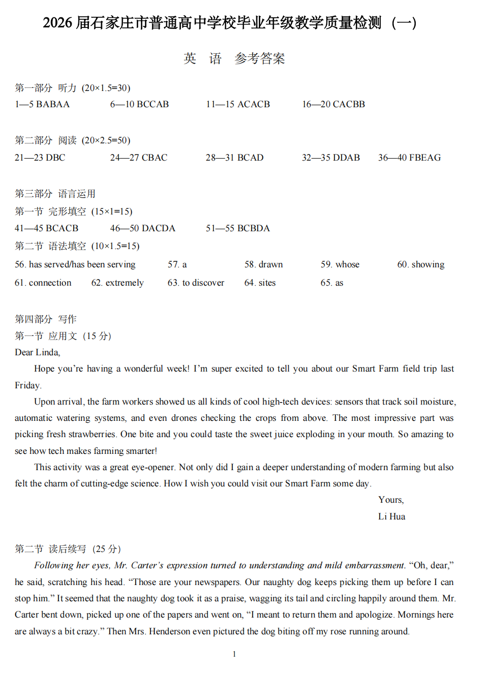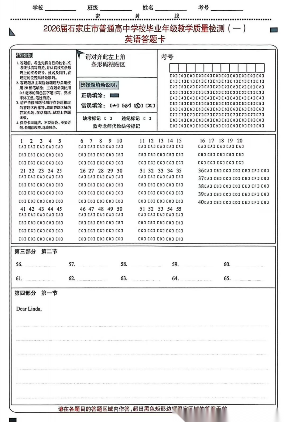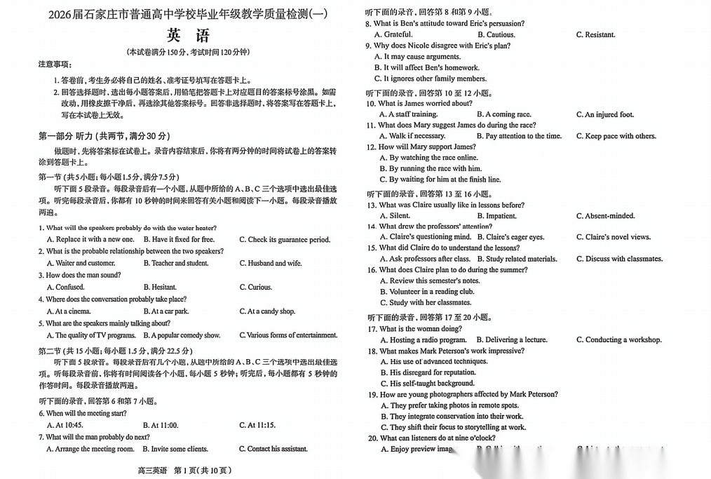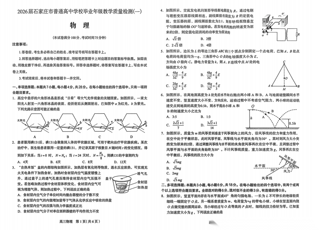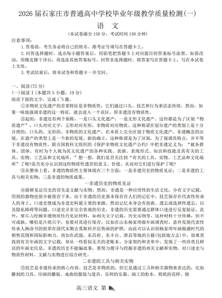 【河北卷】河北省2026届石家庄市普通高中学校毕业年级高三年级教学质量检测(一)(石家庄一模)(3.23-3.25)数学物理英语语文历史试题卷+答案