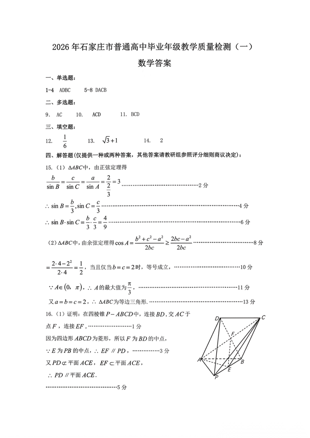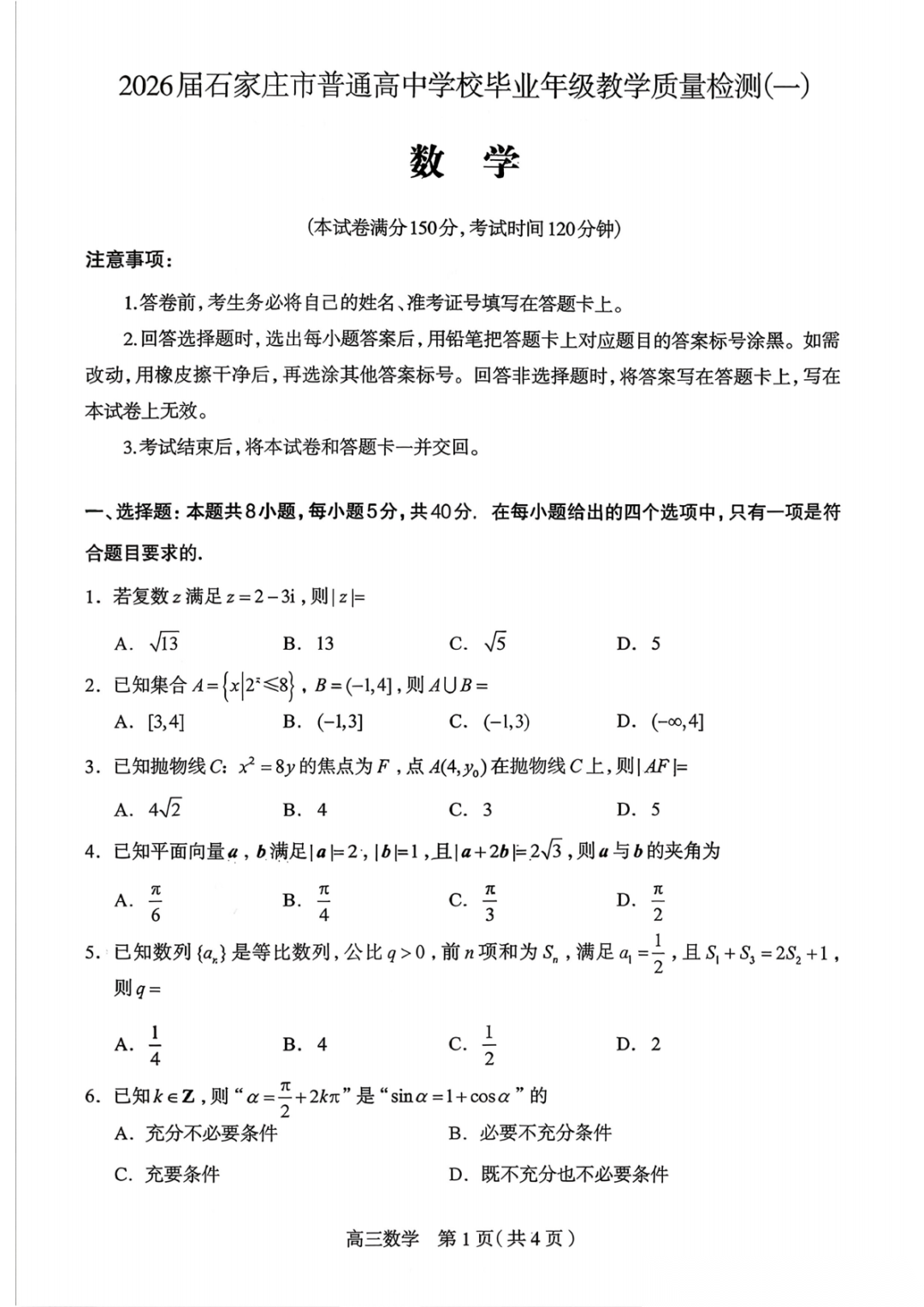 【石家庄一模全科】2026届石家庄市普通高中学校毕业年级教学质量检测(一)