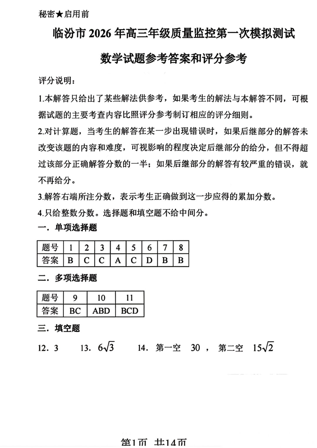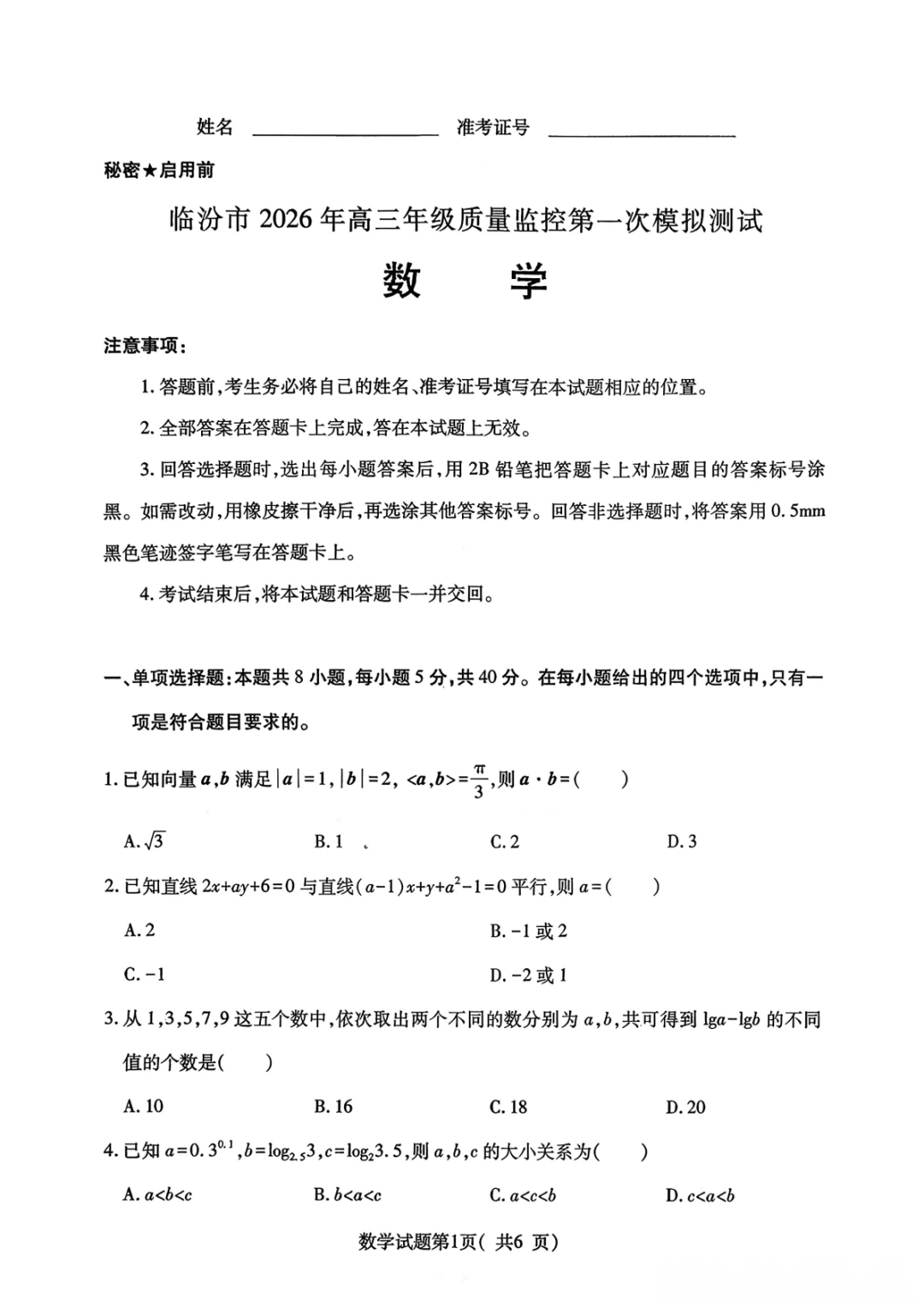 【临汾一模全科】山西省临汾市2026年高三年级质量监控第一次模拟测试