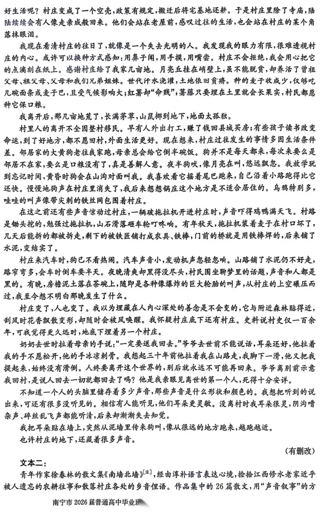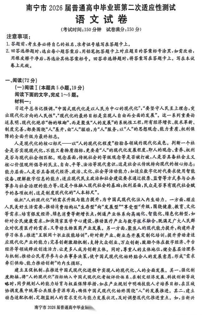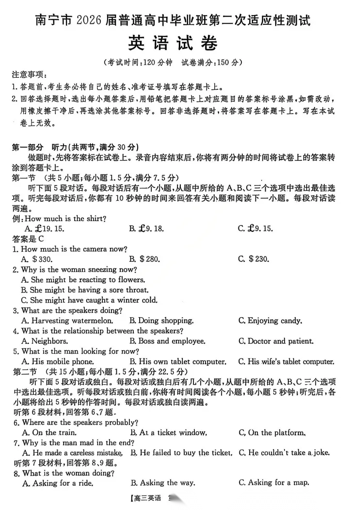 【广西卷】广西壮族自治区南宁市2026届普通高中毕业班第二次适应性测试高三第二次适应性测试(南宁二模)(3.23-3.25) 全科试题卷+答案