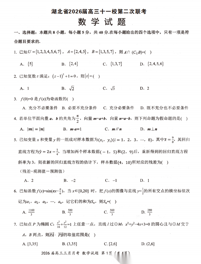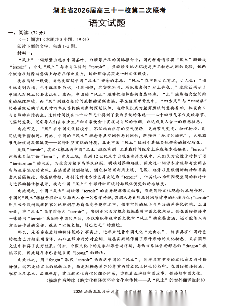 【湖北卷】湖北省十一校2026 届高三年级第二次联考(3.25-3.26) 数学语文试题卷+答案