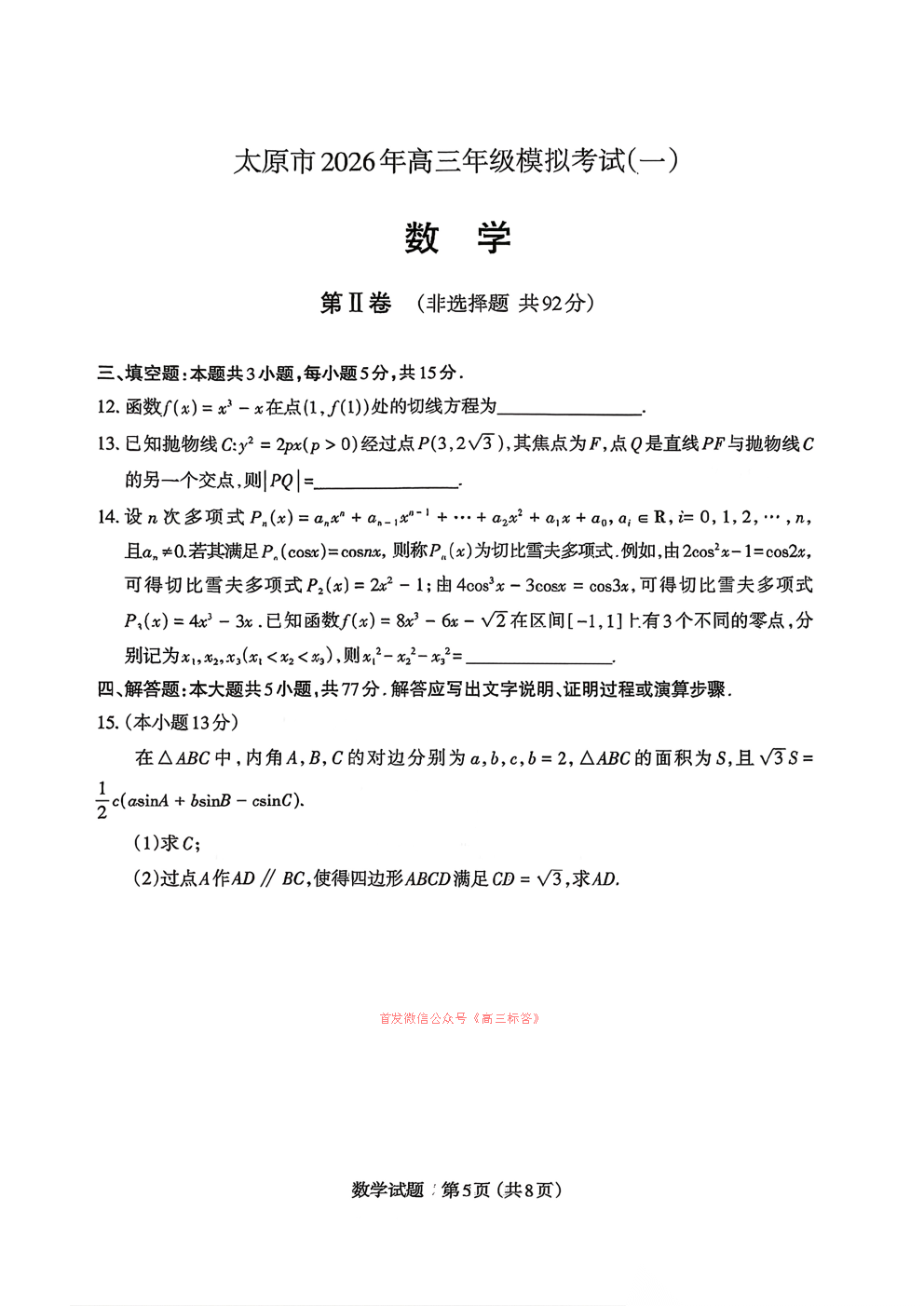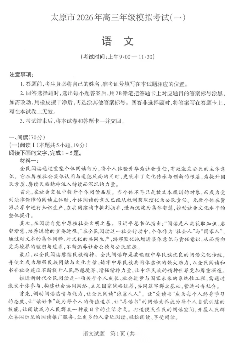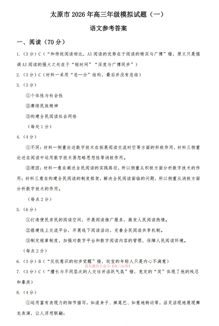 【太原一模】太原市2026年高三年级模拟考试一答案