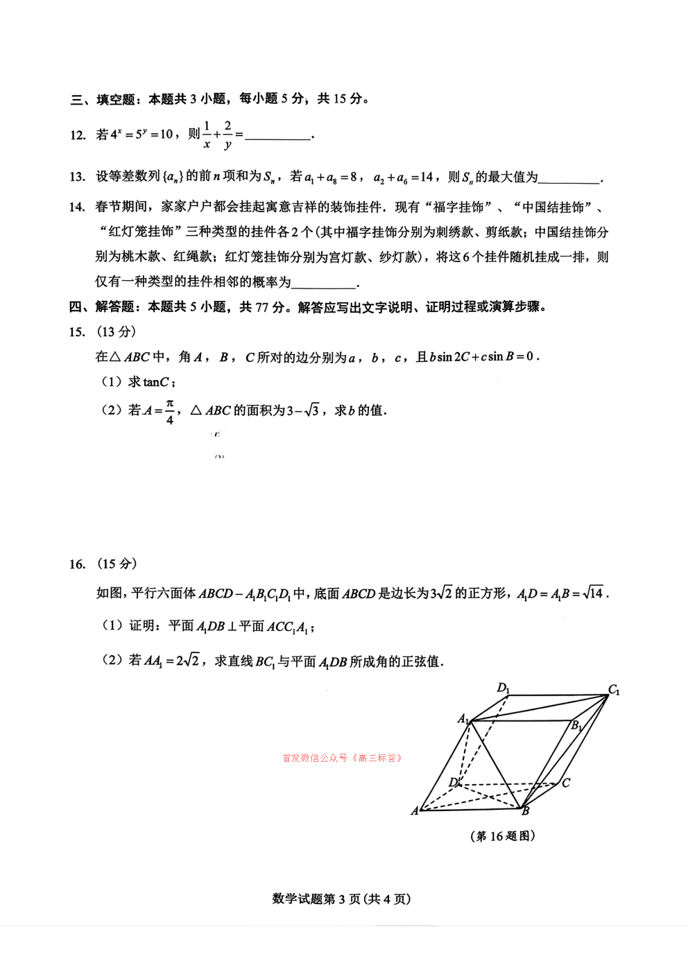 南京、盐城2026届高三年级第一次模拟考试答案 南京、盐城2026届高三年级第一次模拟考试答案