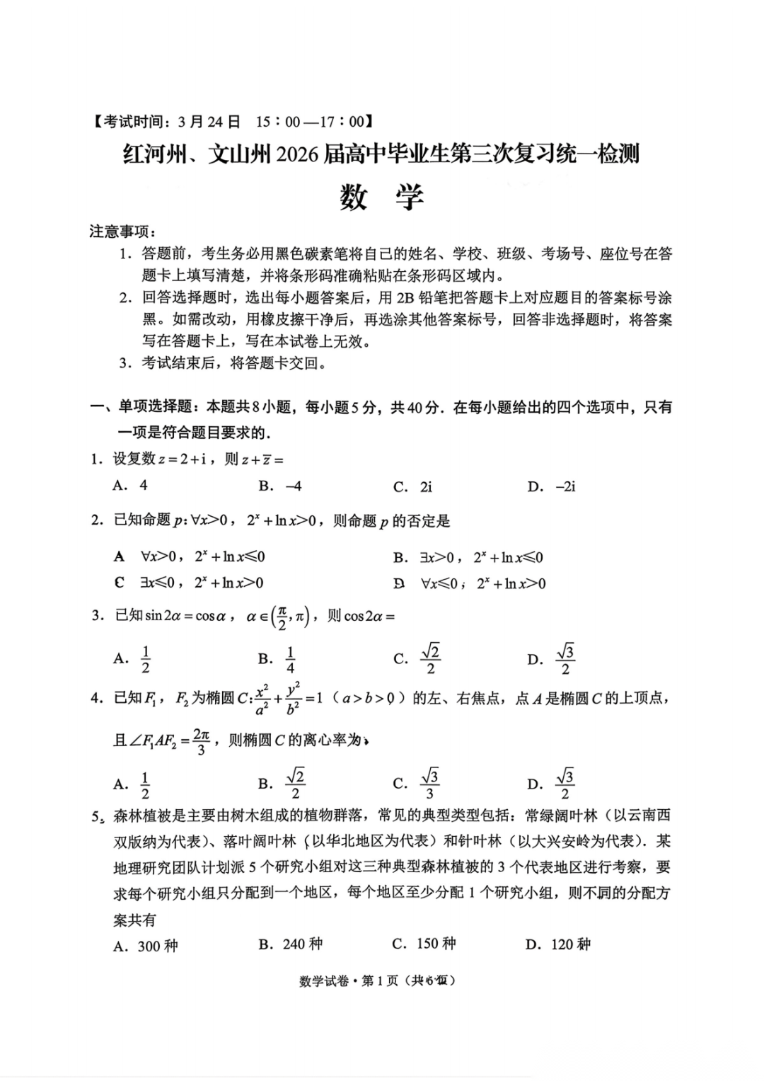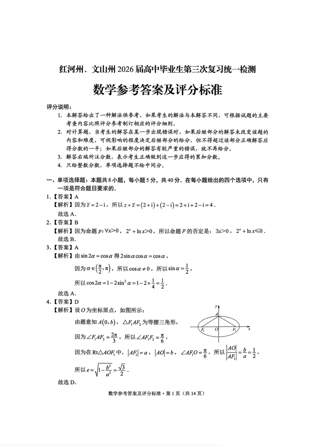 【三模全科】云南省红河州、文山州2026届高中毕业生第三次复习统一检测