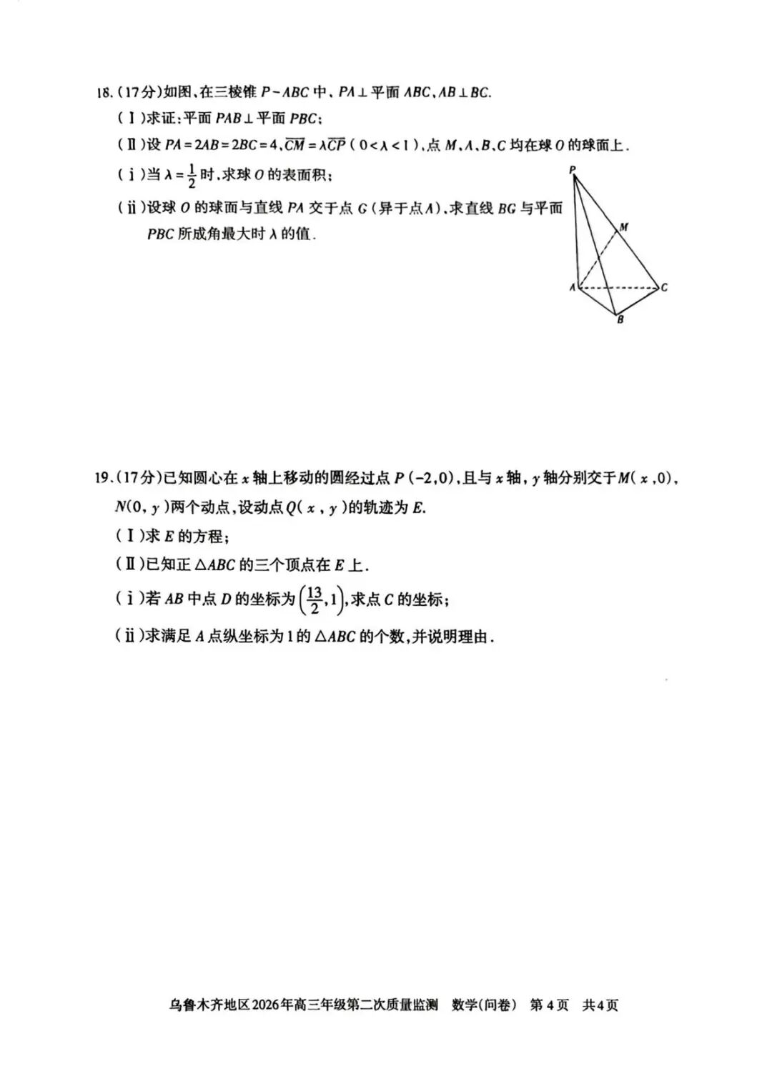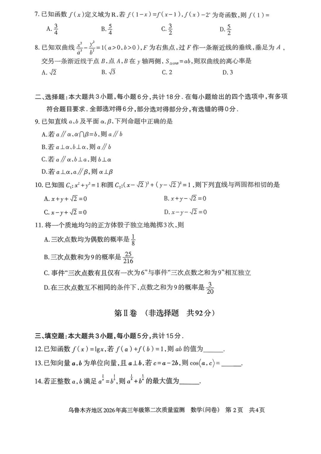【乌鲁木齐二模】2026届新疆乌鲁木齐高三第二次质量监测试卷及答案汇总
