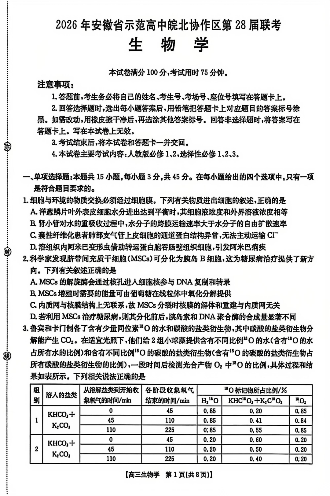 【安徽卷】安徽省2026年安徽省示范高中皖北协作区第28届联考(3.26-3.27) 化学生物语文地理政治试题卷+答案