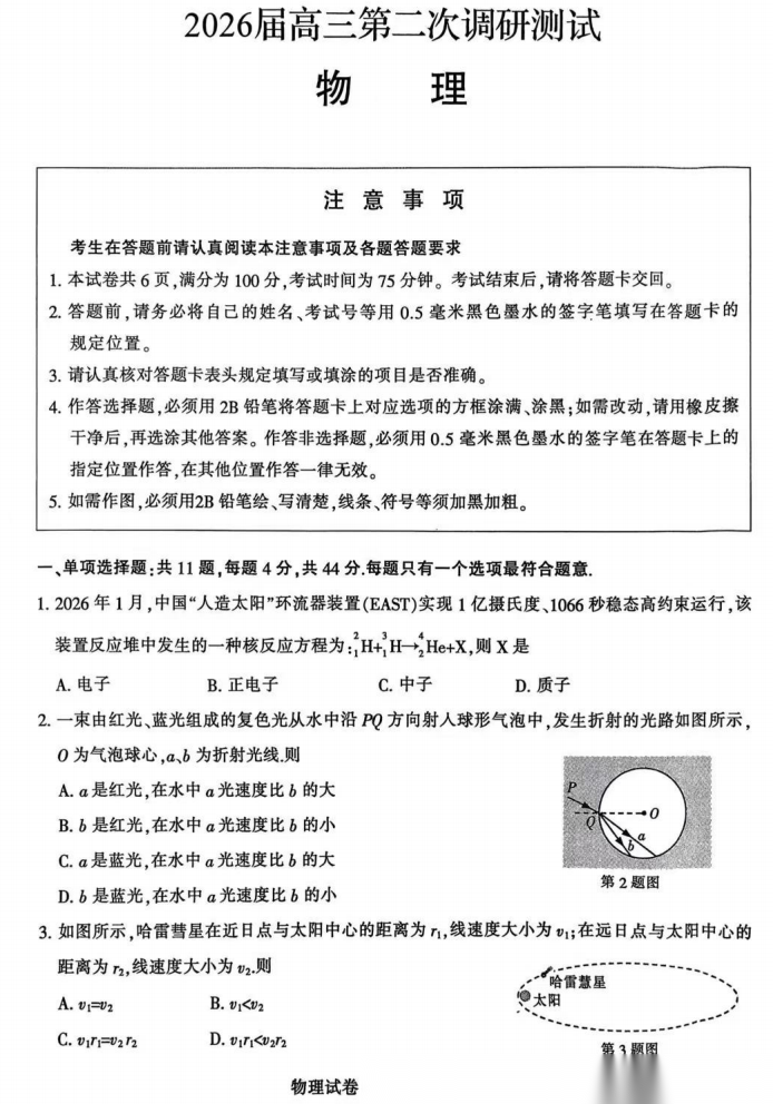 【江苏卷】江苏省苏北南通、徐州、扬州、连云港、淮安泰州宿迁七市2026届高三第二次调研考试(3.25-3.27)数学物理英语语文历史试题卷+答案