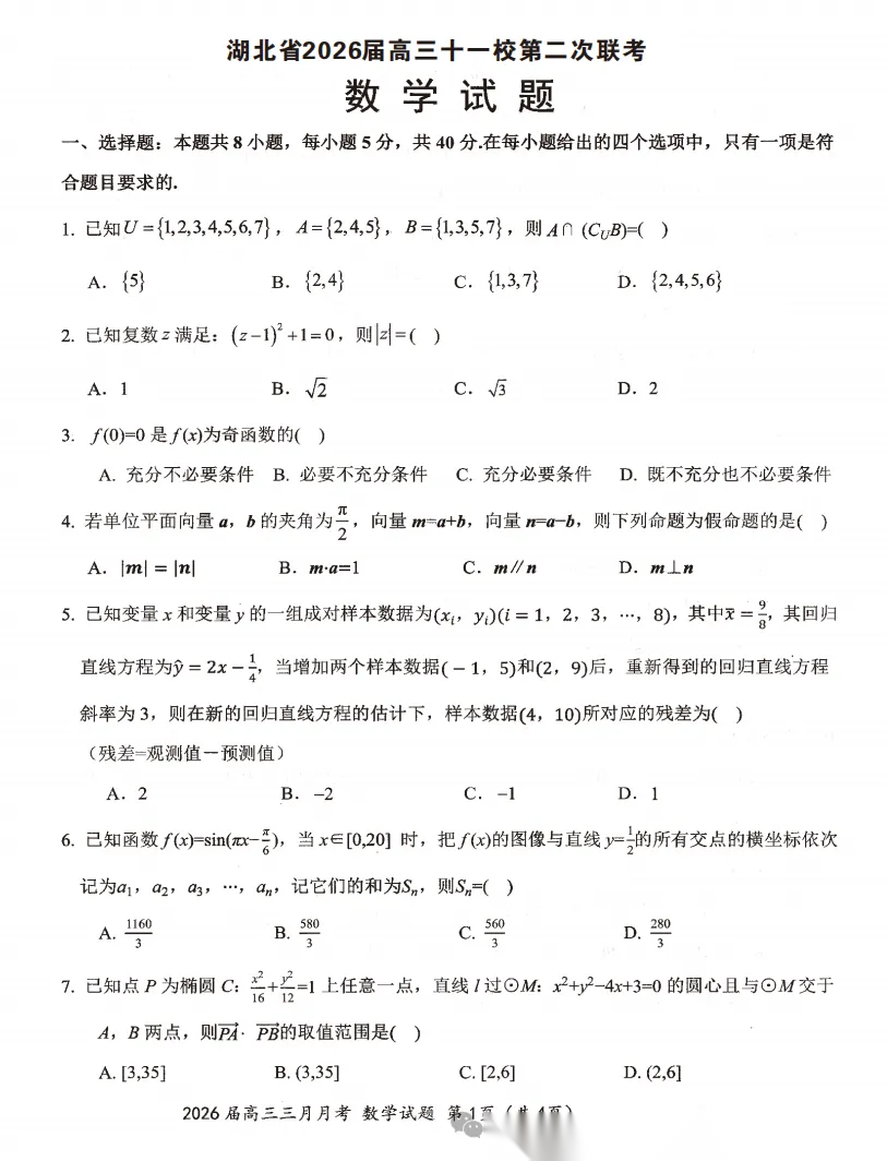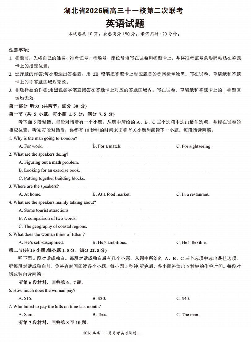 【湖北卷】湖北省十一校2026 届高三年级第二次联考(3.25-3.26) 全科试题卷+答案