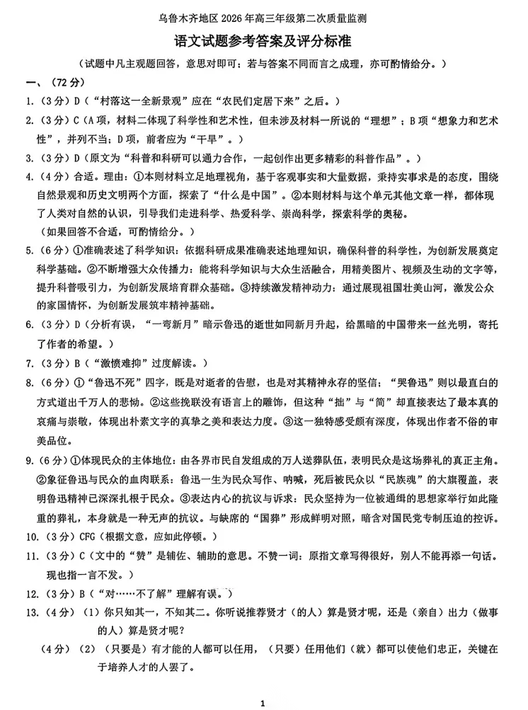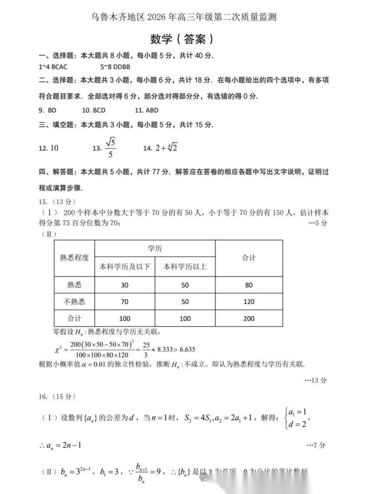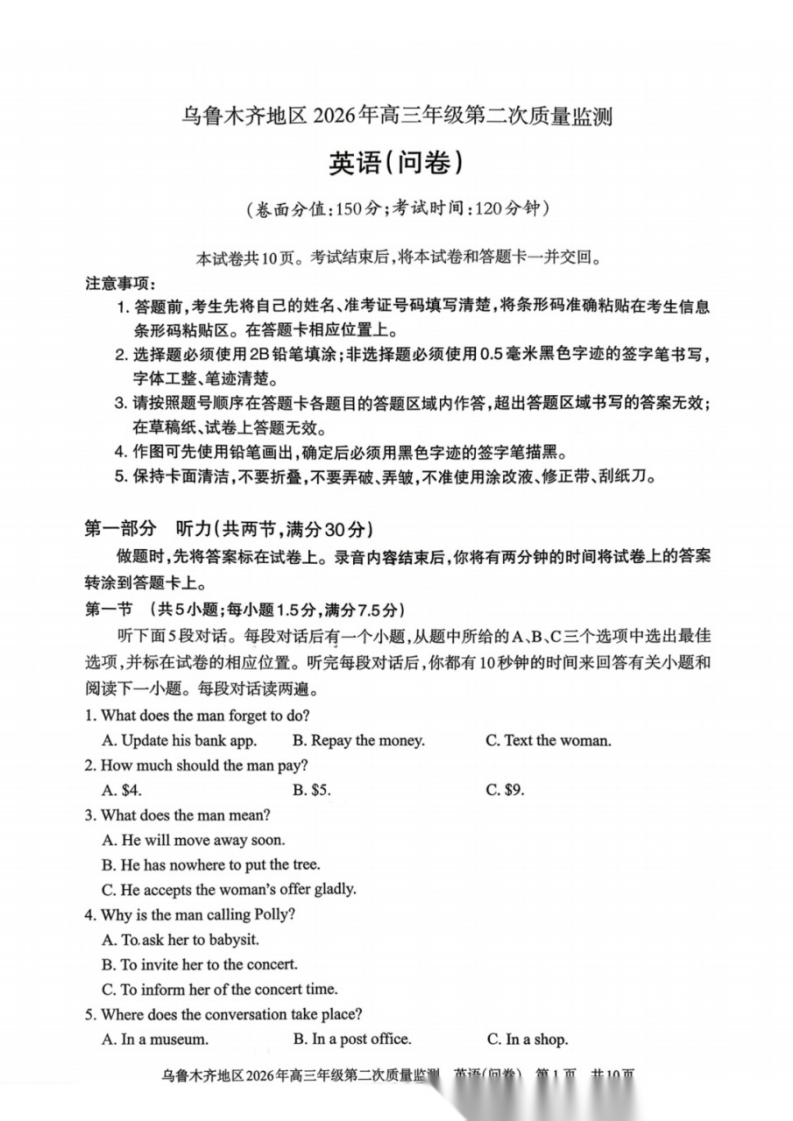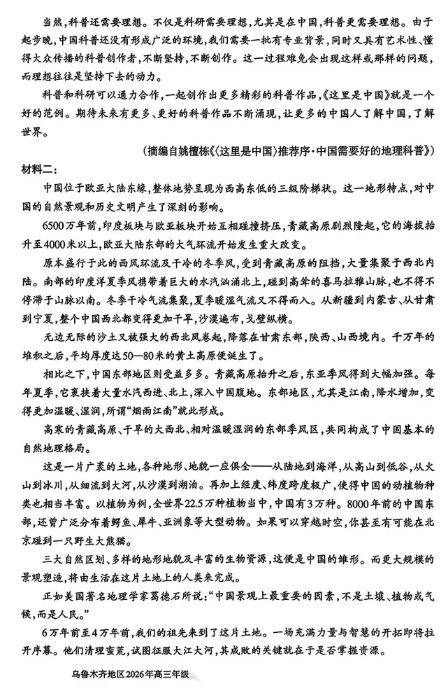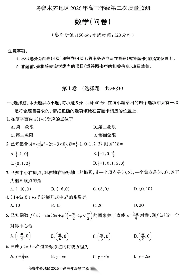 【老(旧)高考卷】新疆维吾尔族自治区乌鲁木齐地区2026年高三年级第二次质量监测(乌鲁木齐二模)(3.25-3.26) 全科试题卷+答案