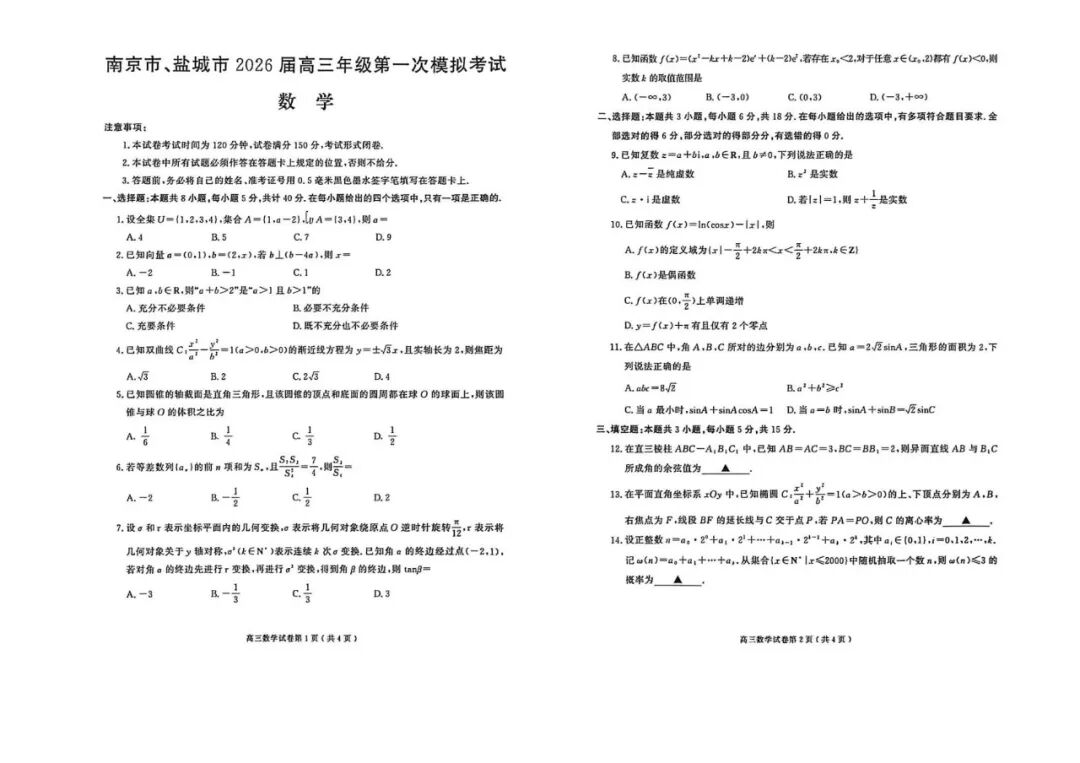 【南京盐城高三一模】2026届江苏南京盐城高三第一次模拟考试试卷及答案汇总