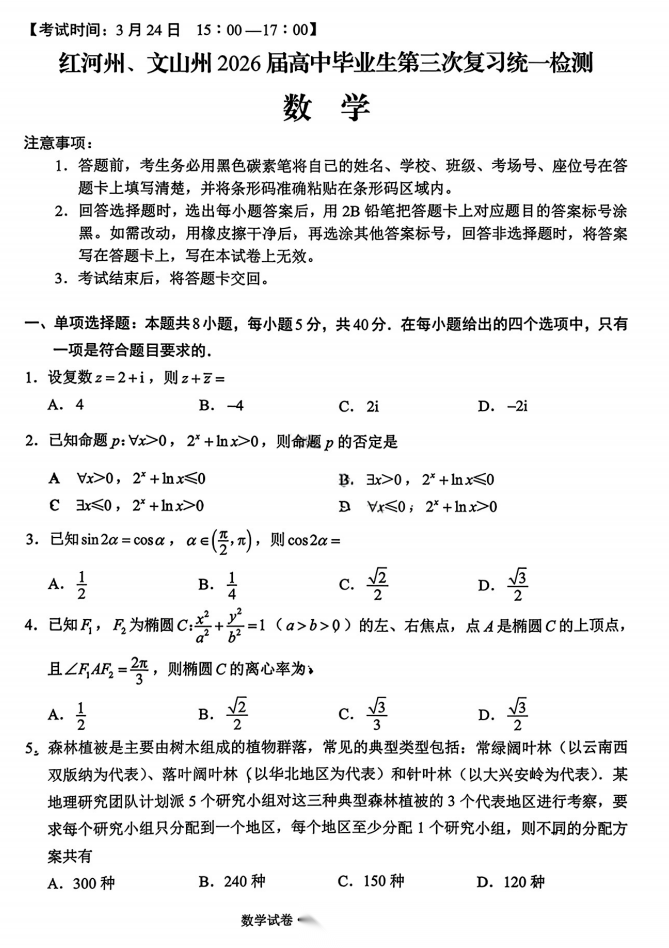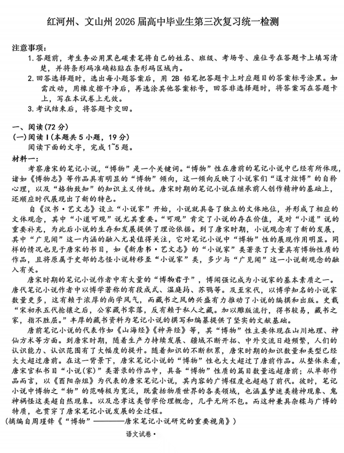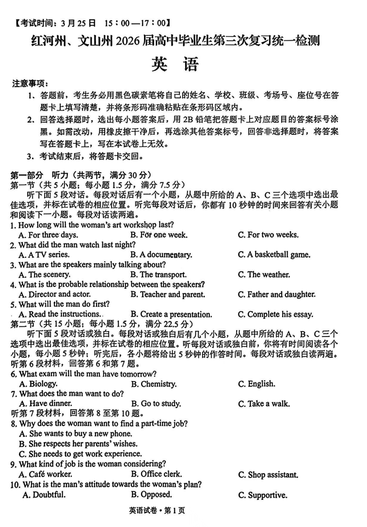 【云南卷】云南省红河州、文山州2026届高中毕业生第三次复习统一检测(红河文山三统)(3.24-3.26) 全科试题卷(缺化学)+答案