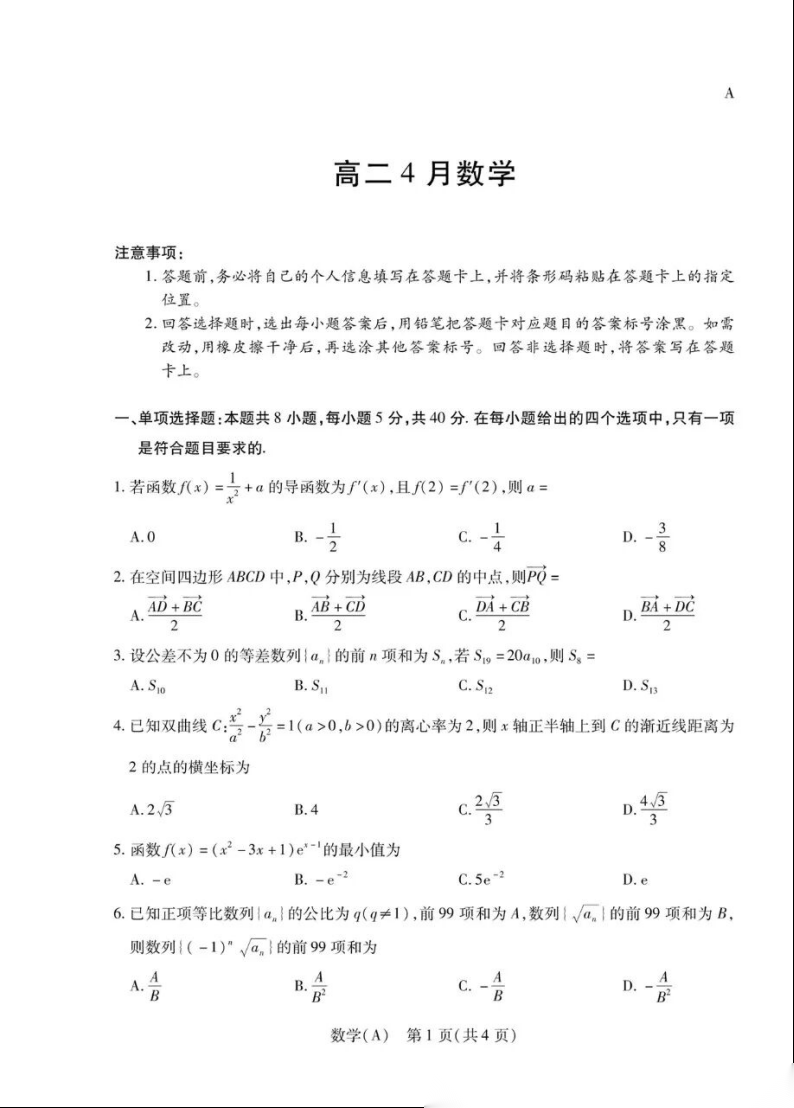 【安徽卷】【高二】安徽省 T-Y 大联考多校2025-2026学年高二年级下期4月联考(4.1-4.2) 理科全科试题卷+答案