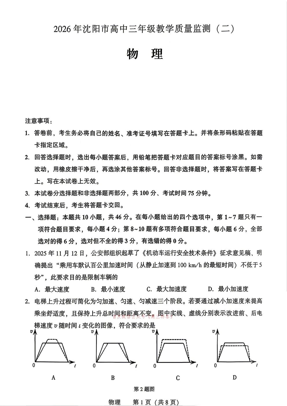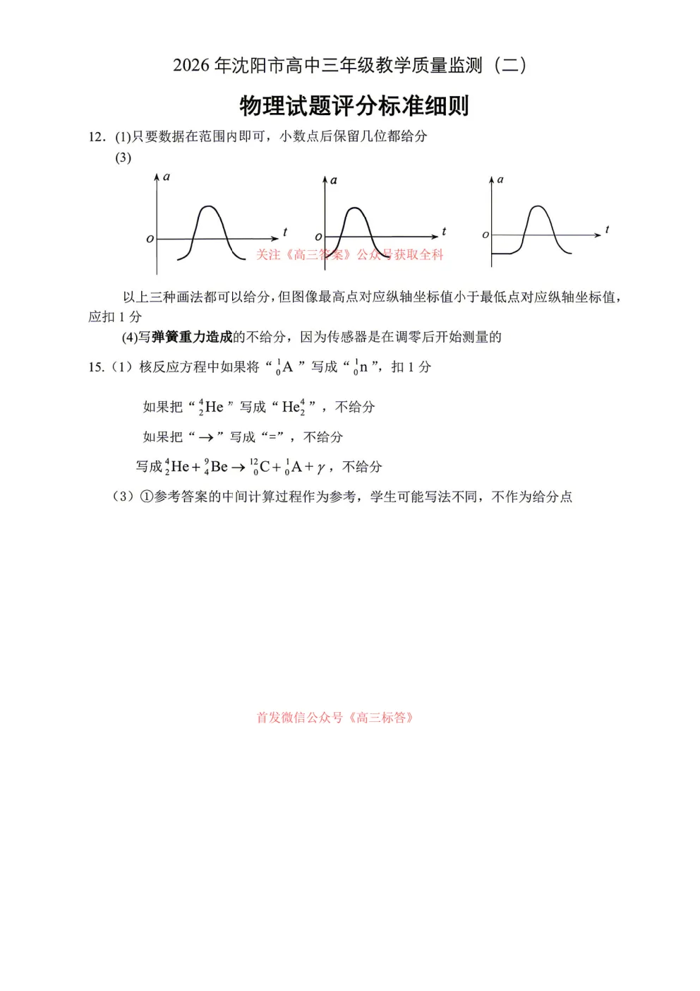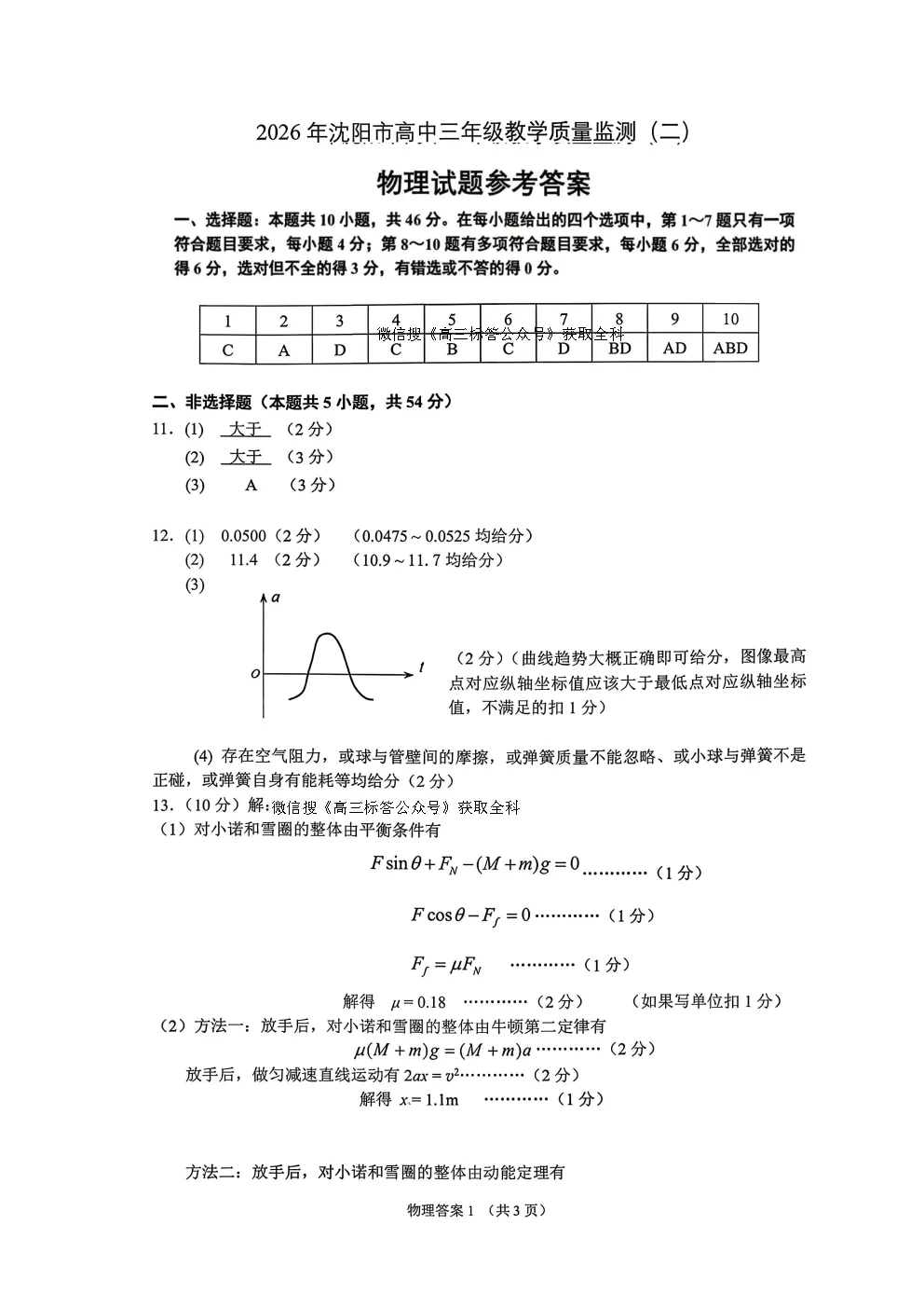 【沈阳二模】2026年沈阳市高中三年级教学质量监测二语数英物理历史答案