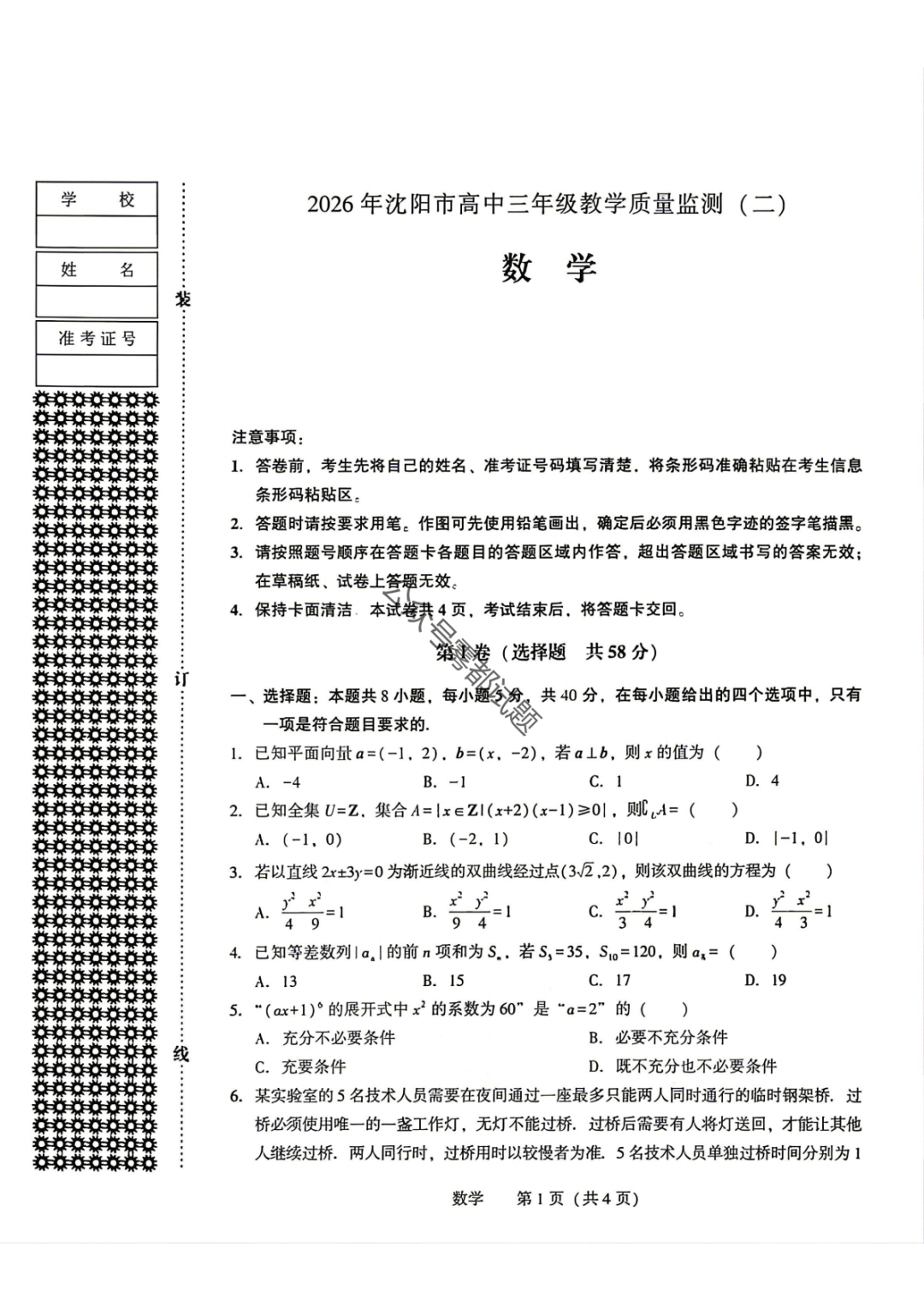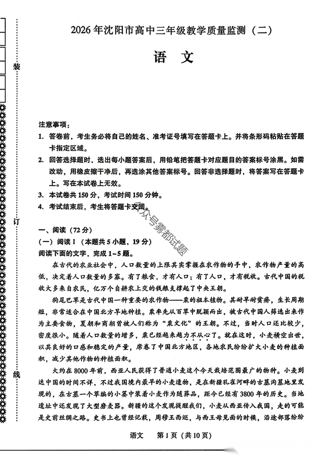 【沈阳二模】2026年辽宁省沈阳市高三下学期教学质量监测(二)语、数试题