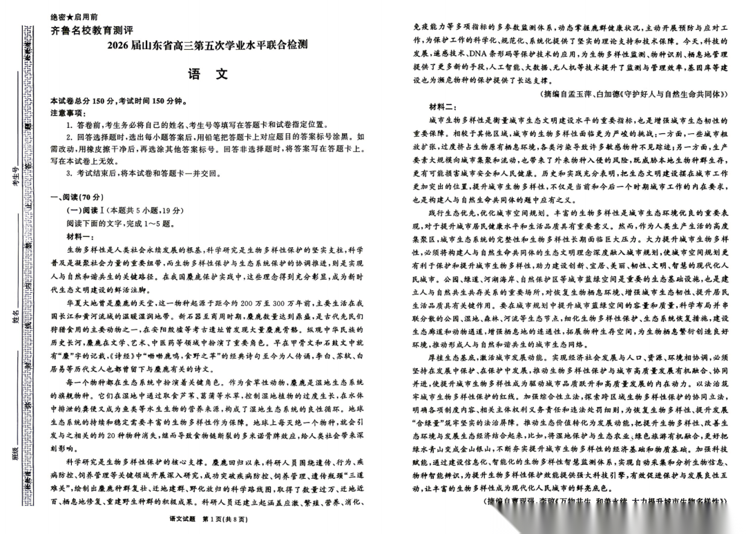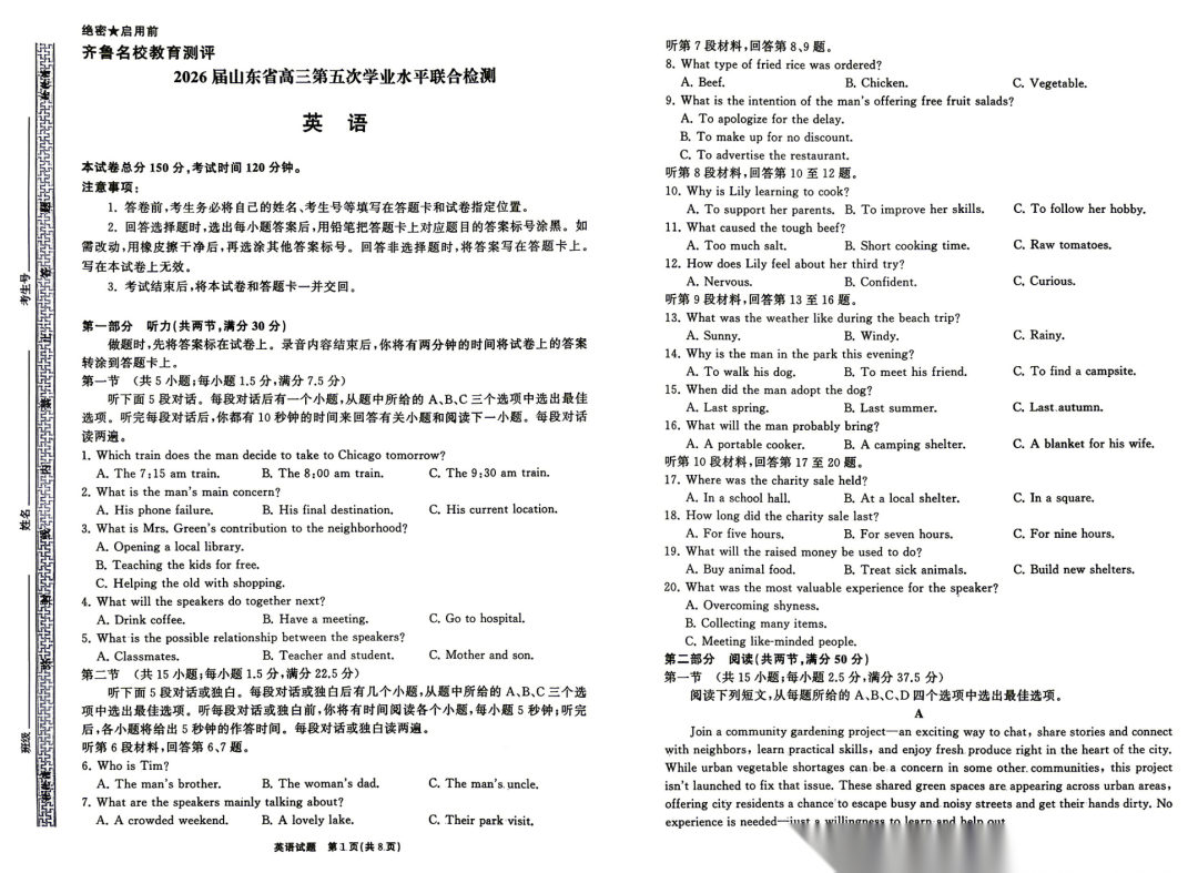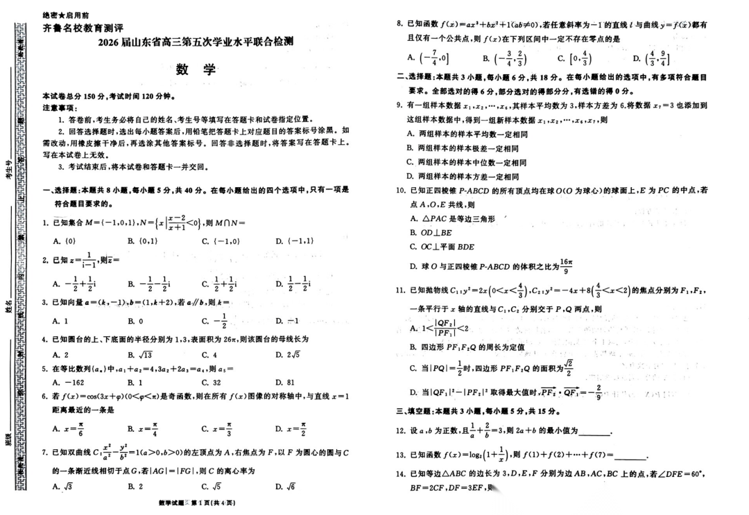 【补齐重发】【山东卷】山东省齐鲁名校教育测评大联考2026届山东省高三年级第五次学业水平联合检测((4.2-4.3) 全科试题卷+答案