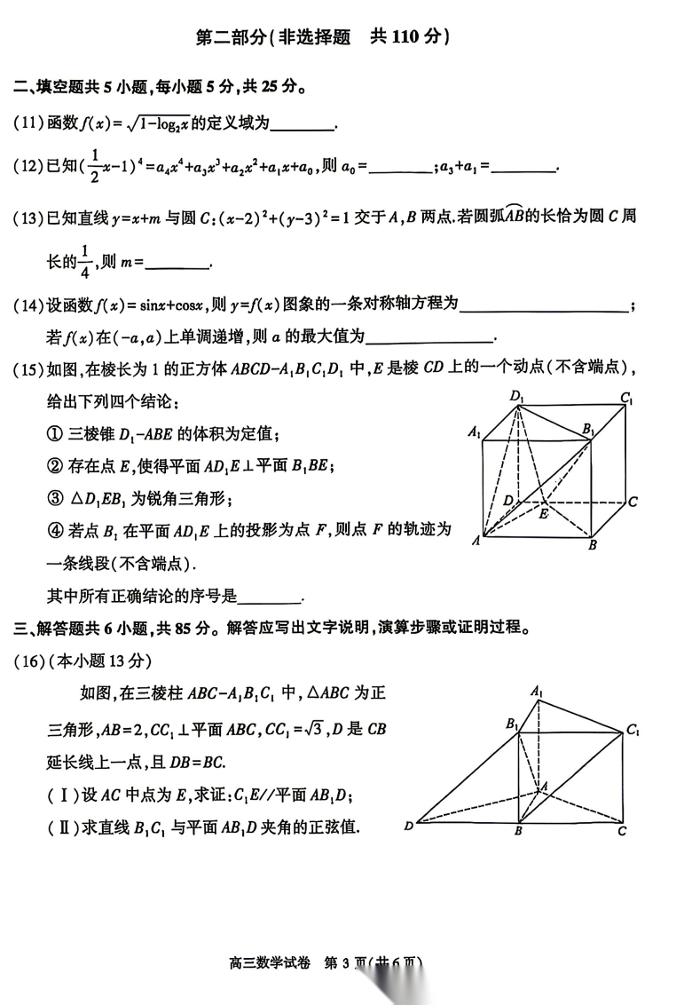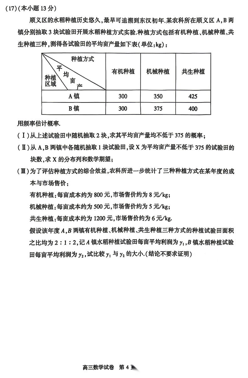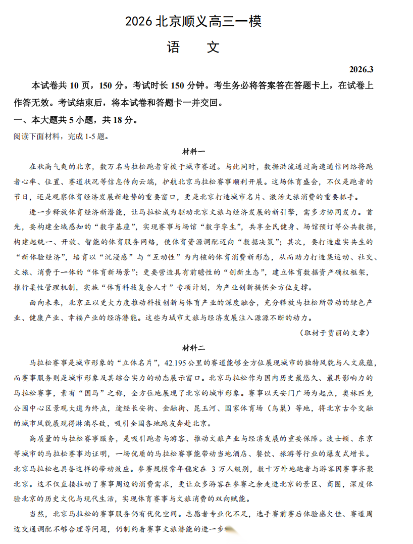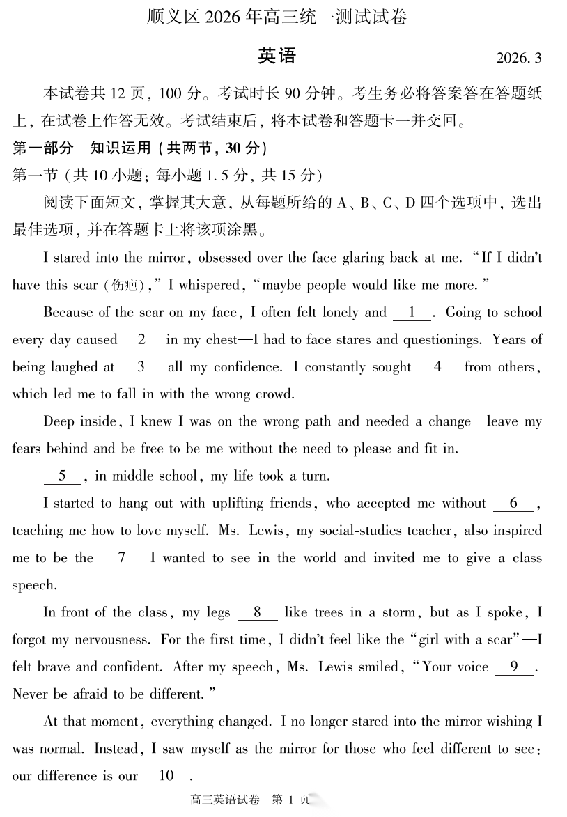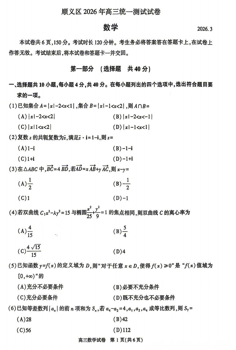 【北京卷】北京市顺义区2026年高三年级统一测试试卷(顺义高三一模)(3.30-4.2) 全科试题卷(缺地政)+答案