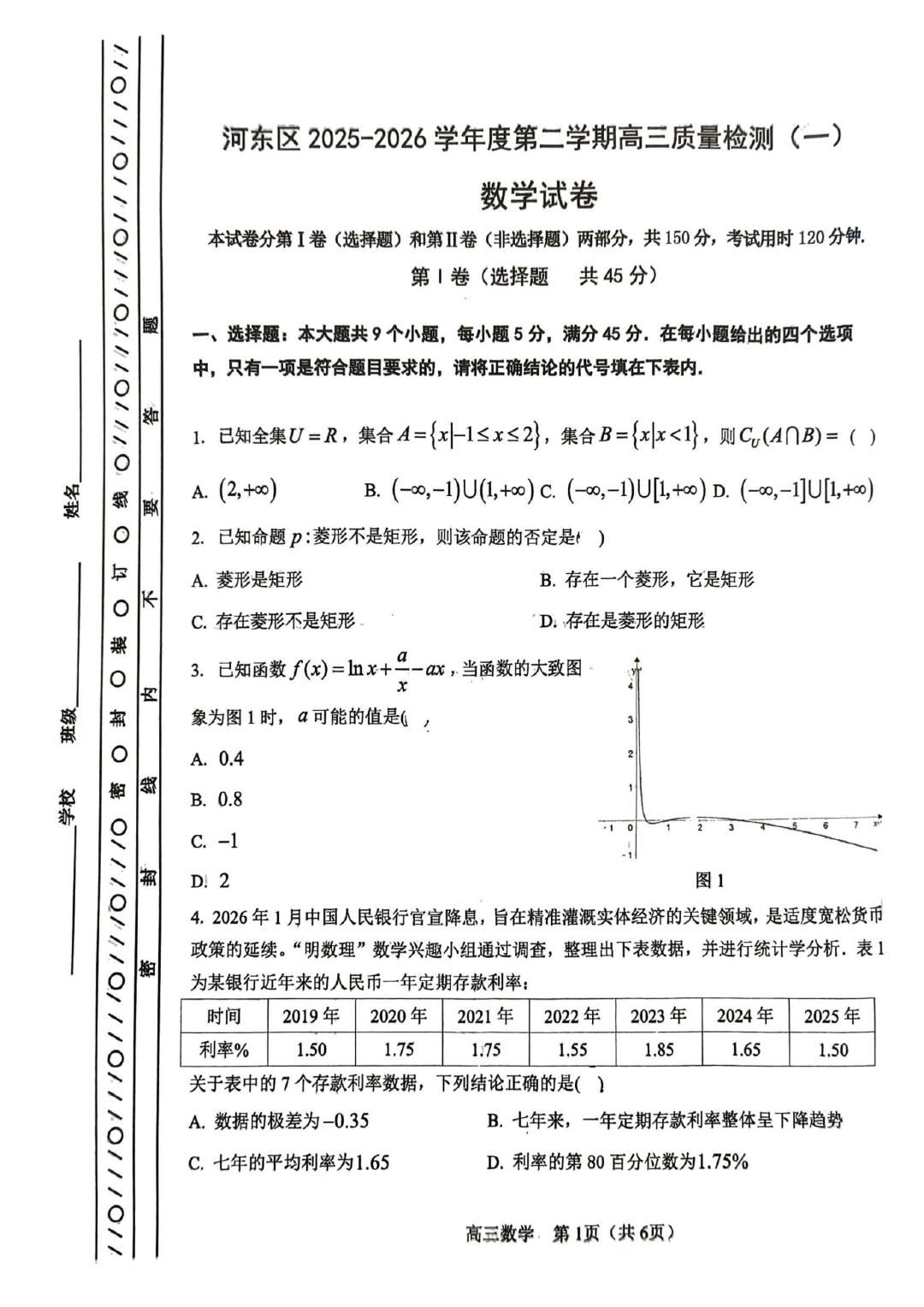 天津市河东区2026届高三下学期总复习质量检测(一)