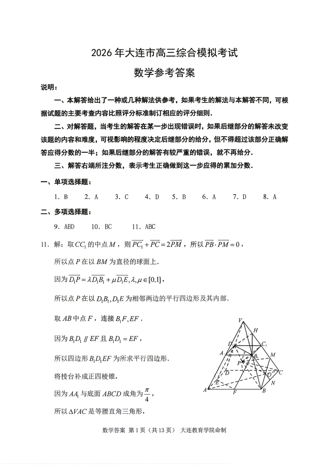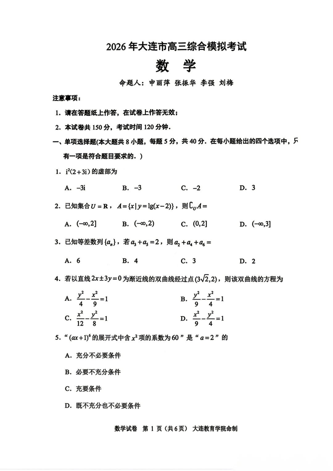 【大连一模全科】辽宁省大连市2026届高三综合模拟考试(一)