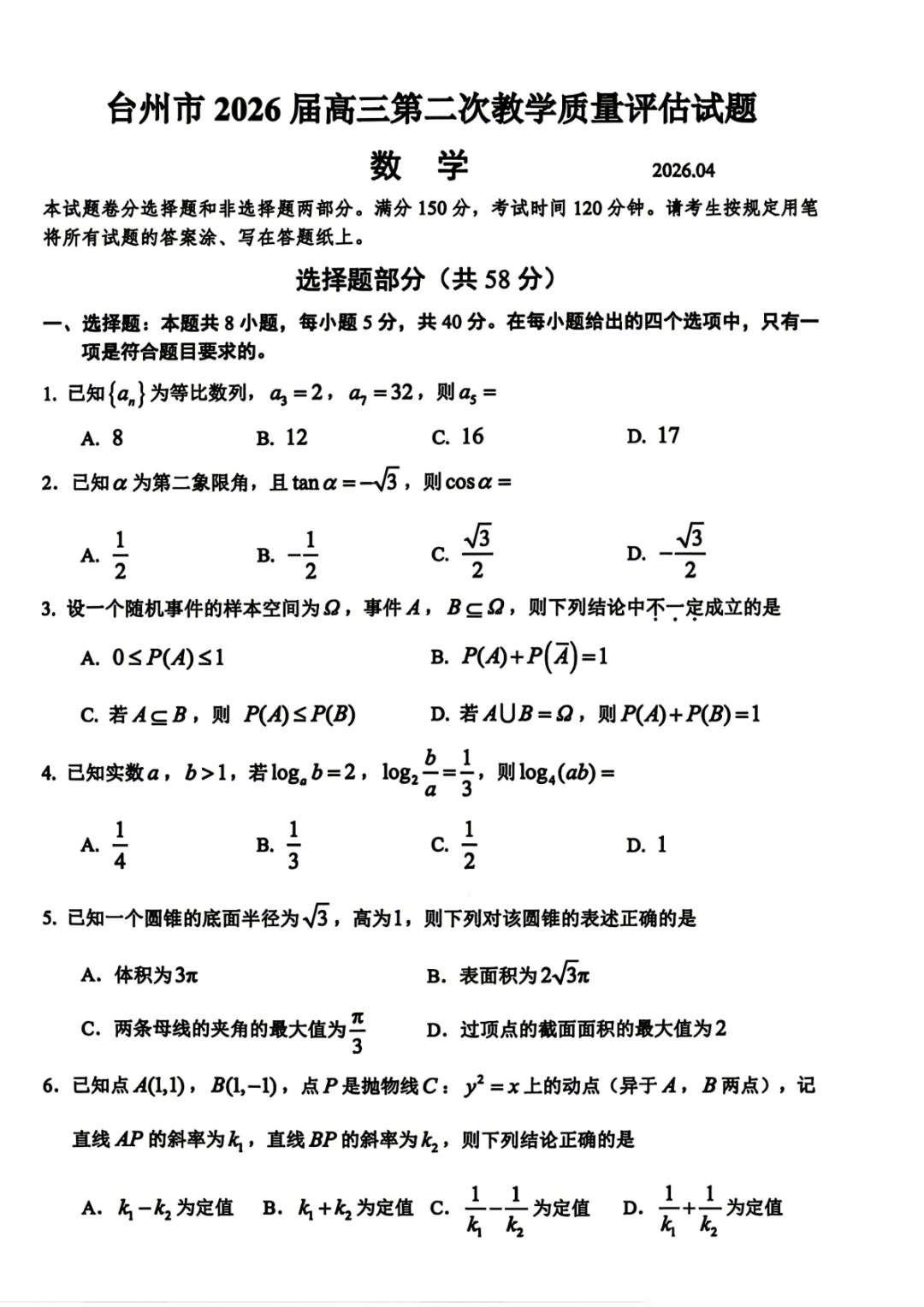【台州二模全科】浙江省台州市2026届高三第二次教学质量评估