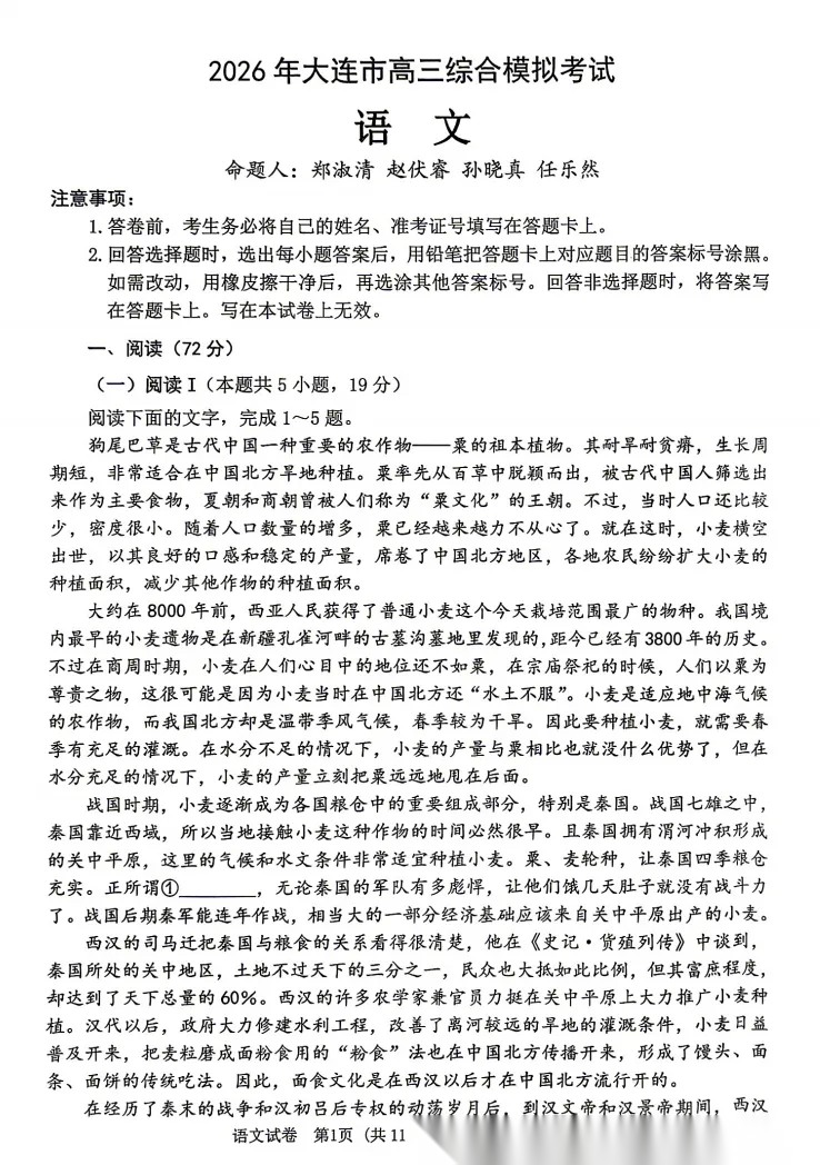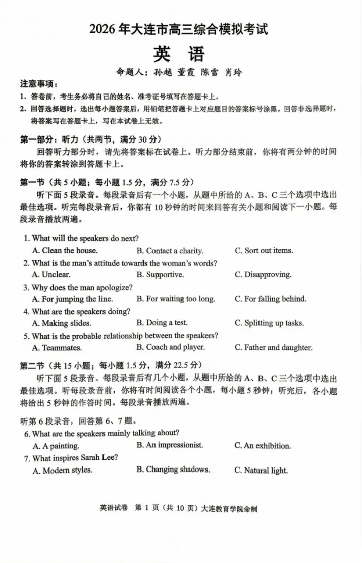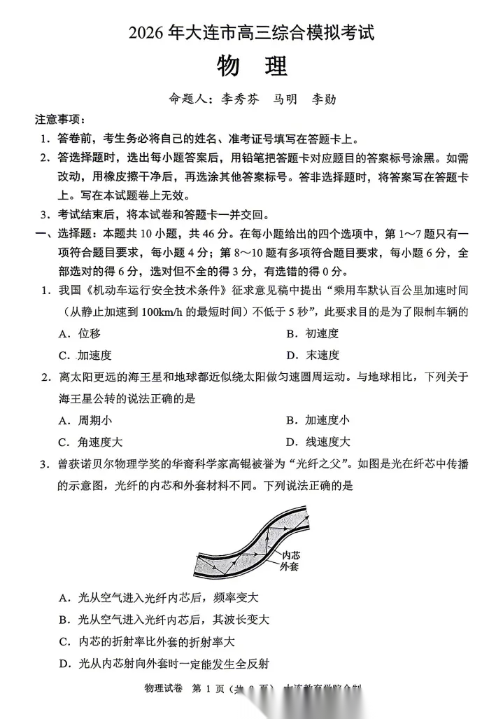 【黑吉辽蒙卷】辽宁省大连市2026年大连市高三年级综合模拟考试(大连高三一模)(4.7-4.9) 全科试题卷+答案