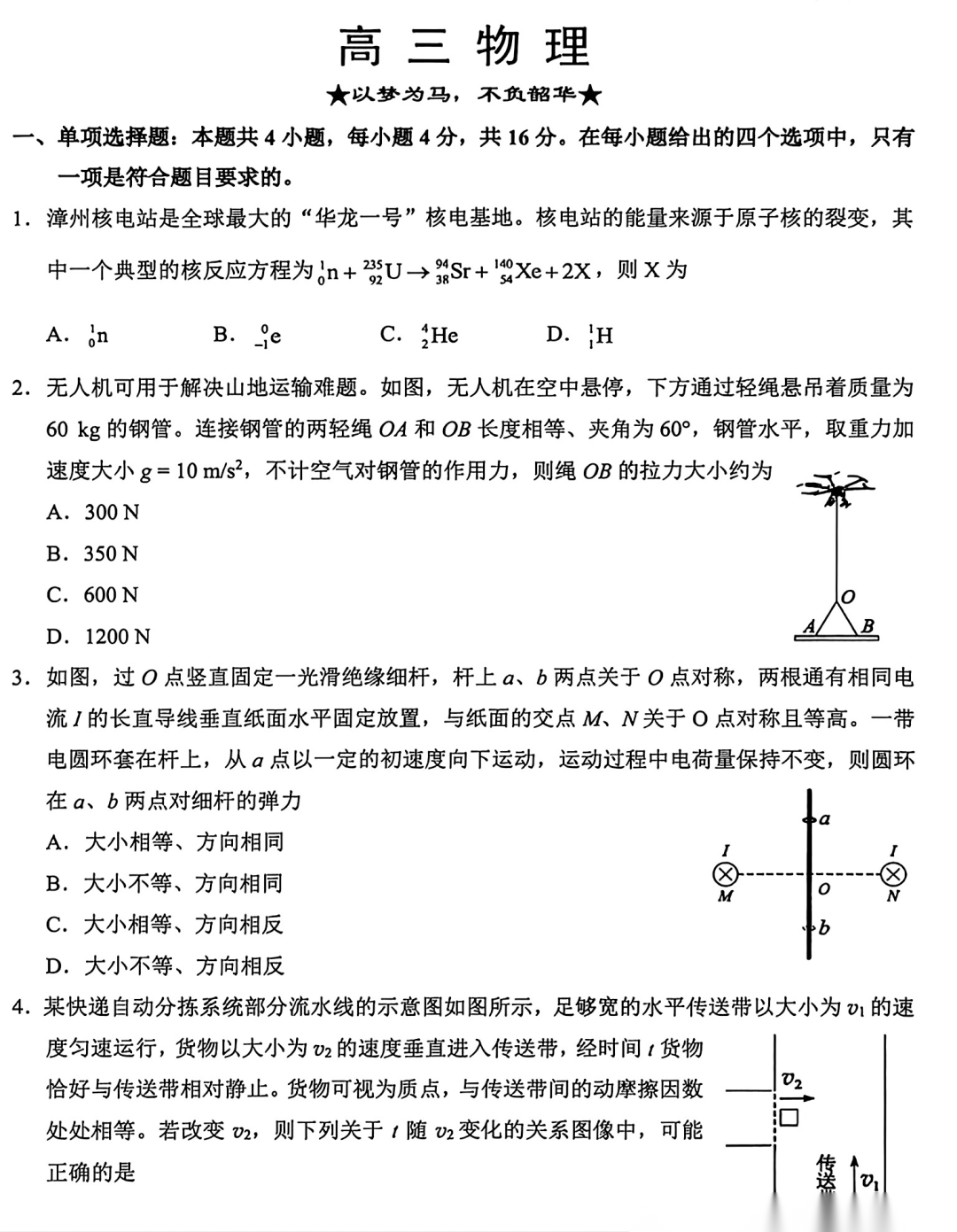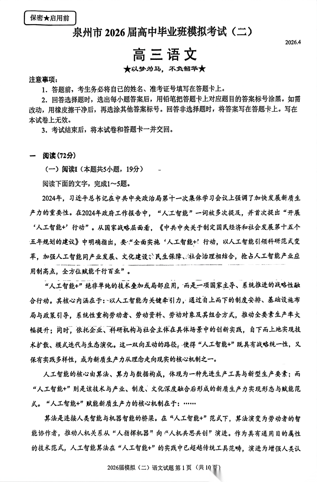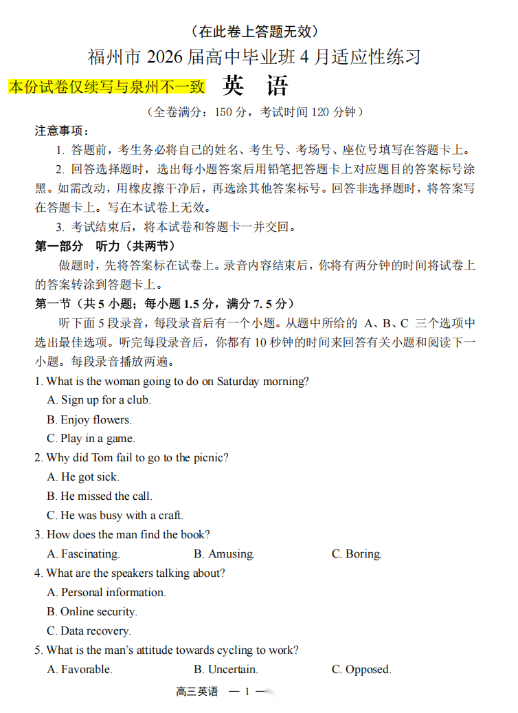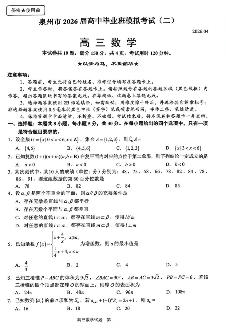 【福建卷】【泉州版】福建省泉州市2026届高中毕业班高三年级模拟考试(二)(泉州二检)(4.8-4.10) 数学物理英语语文历史试题卷+答案