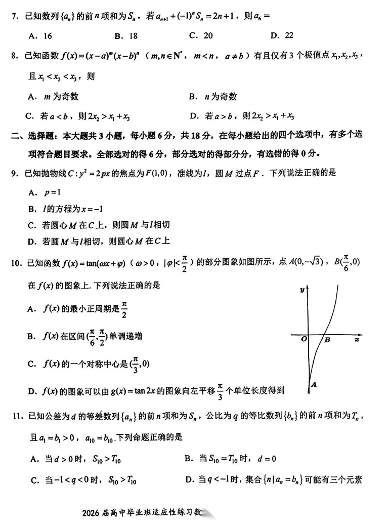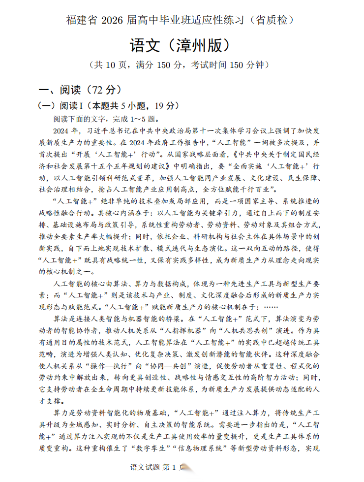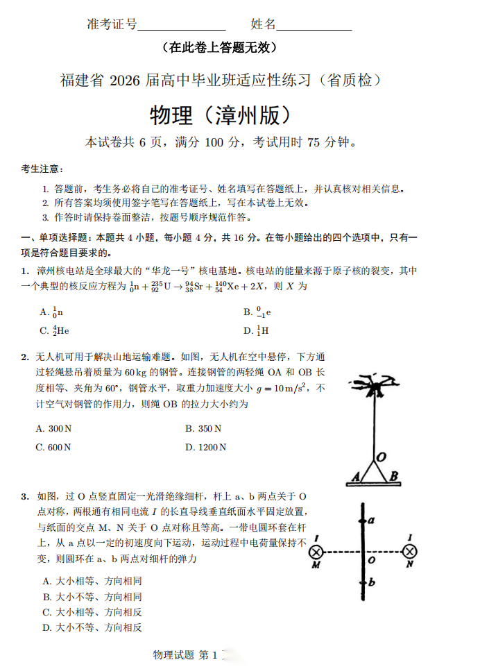 【福建卷】【漳州版】福建省漳州市2026届高中毕业班高三年级适应性理科考生(漳州二检)(4.8-4.10) 数学物理英语语文历史试题卷+答案
