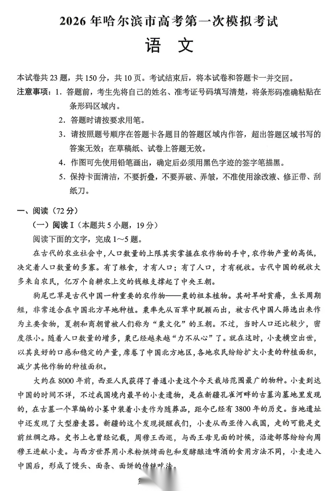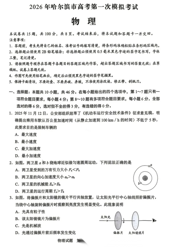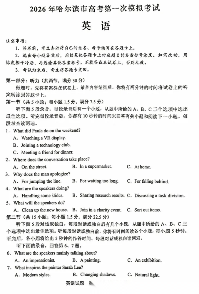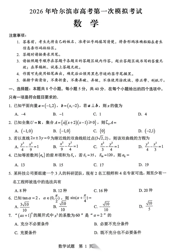 【黑吉辽蒙卷】黑龙江省哈尔滨市2026年高考高三年级第一次模拟考试(哈尔滨一模)(4.7-4.9) 全科试题卷 +答案