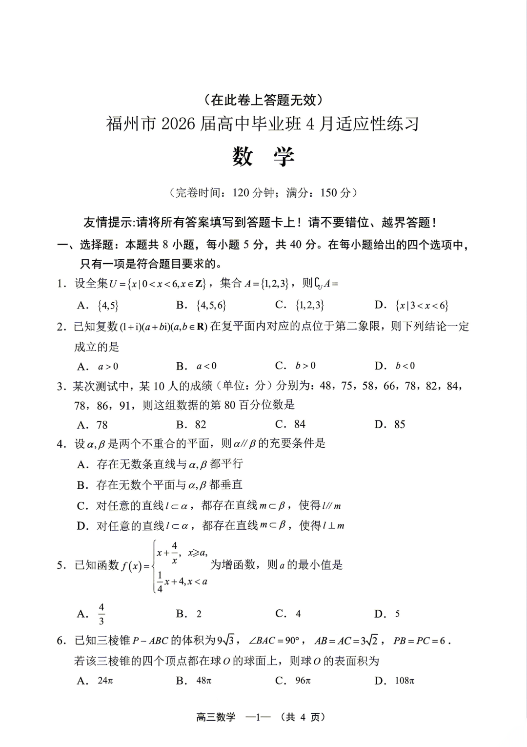 【福州二模】福建省2026届高三4月适应性练习全科下载