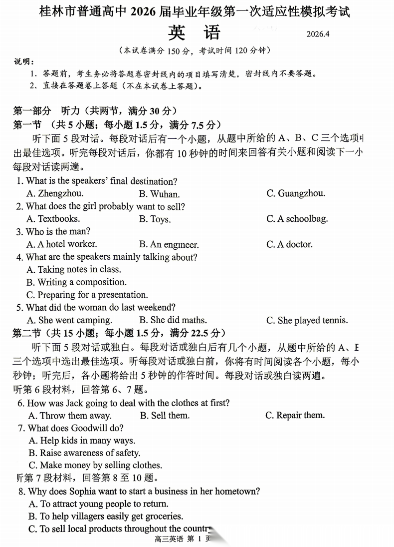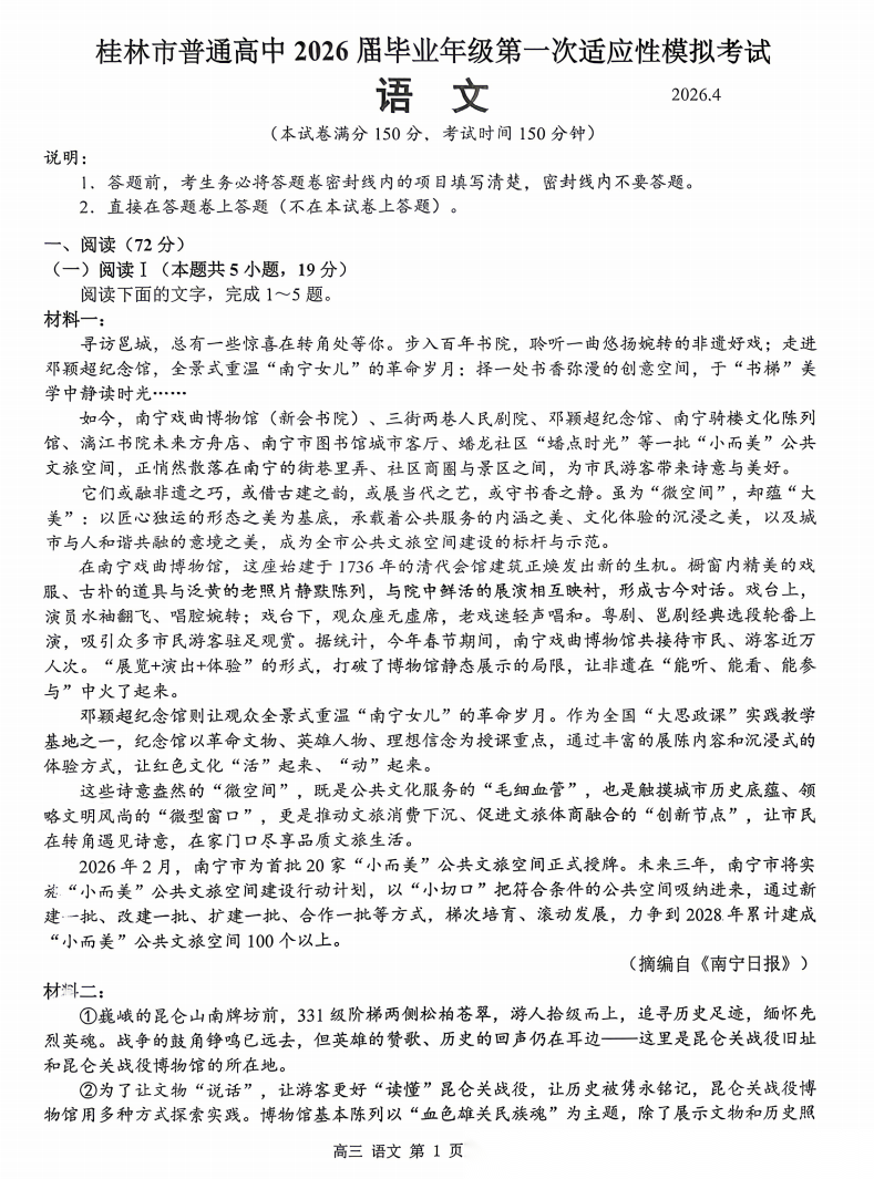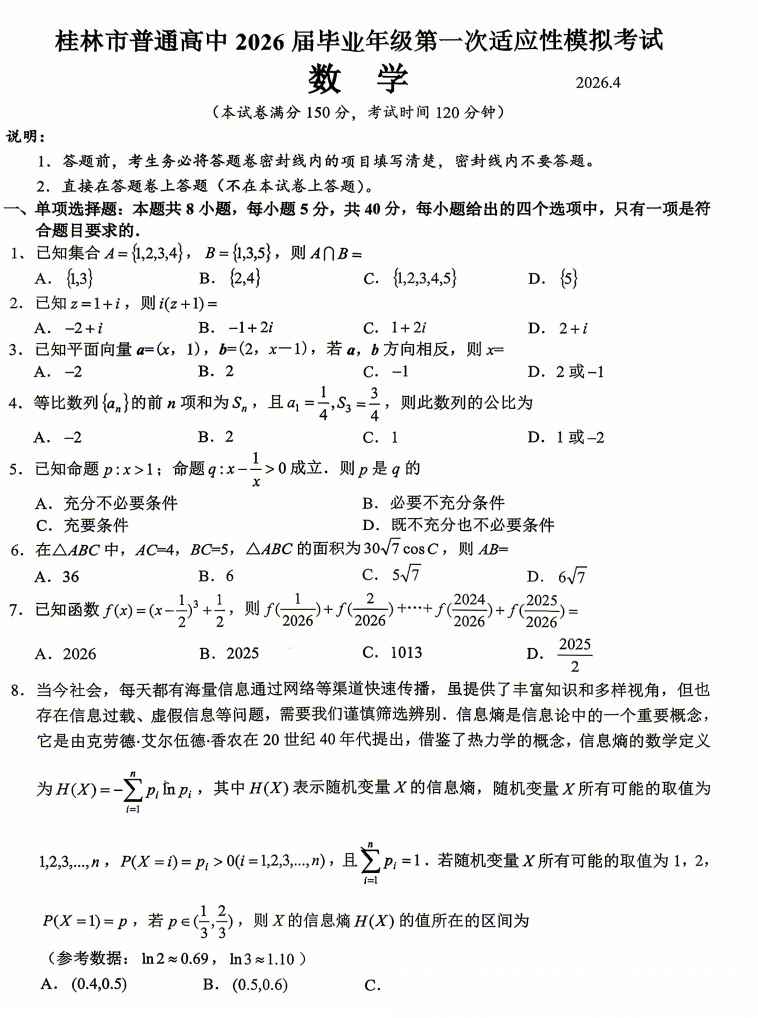 【广西卷】广西壮族自治区桂林市普通高中2026届毕业年级高三年级第一次适应性模拟考试(桂林一模)(4.7-4.9) 全科试题卷(缺生物历史)+答案
