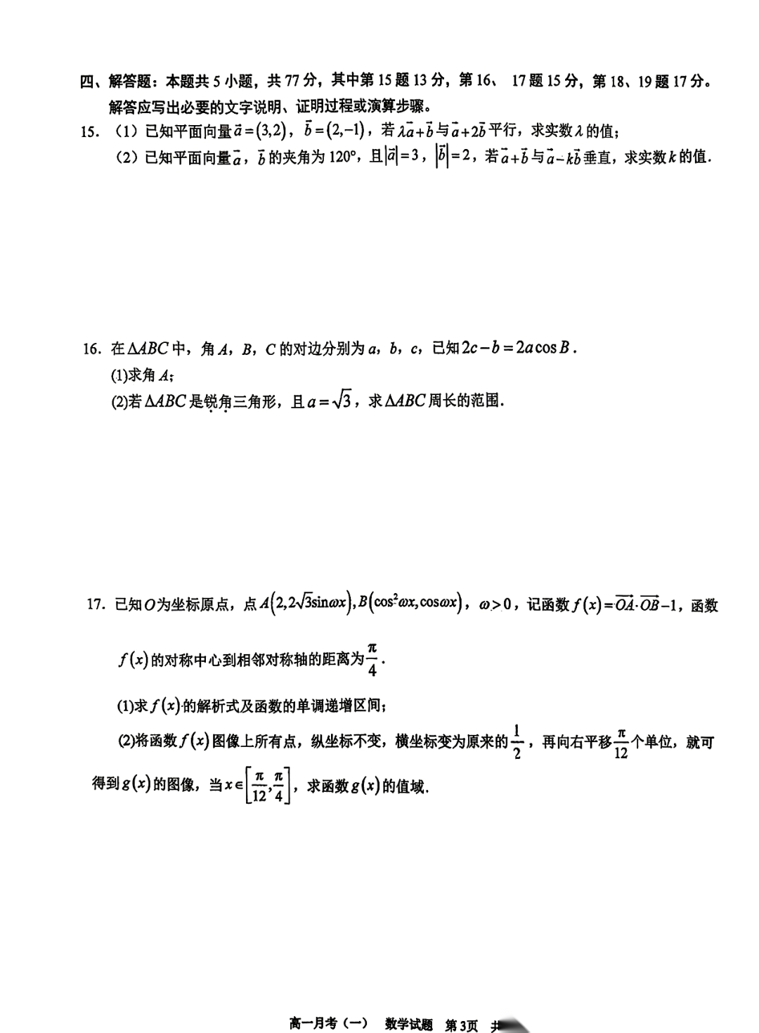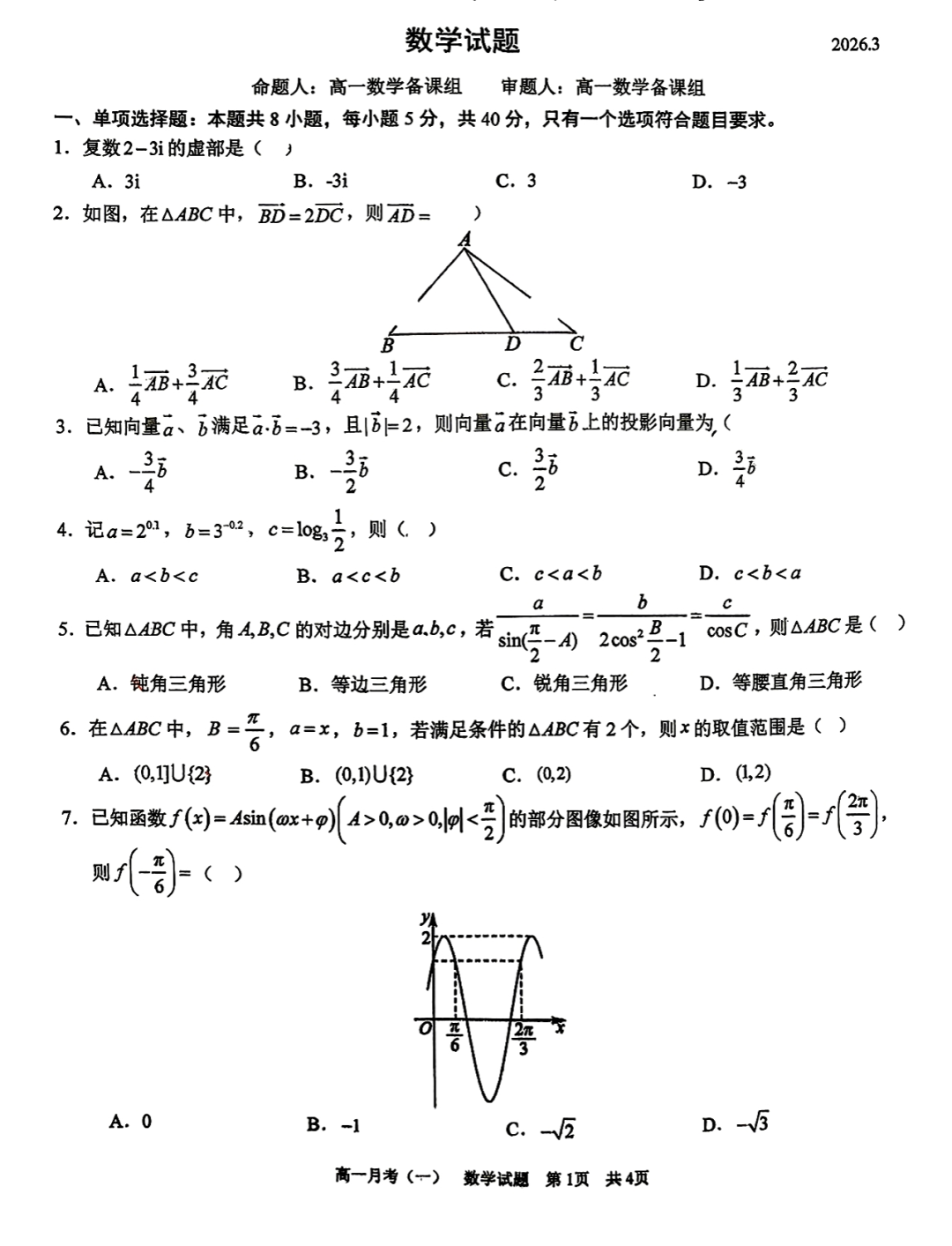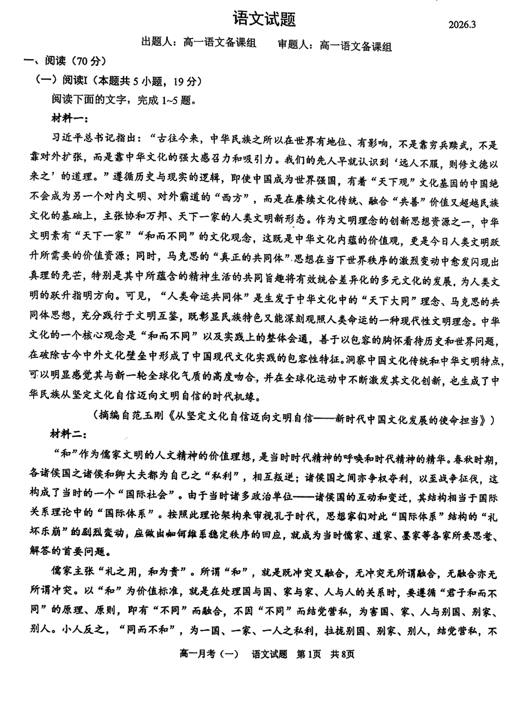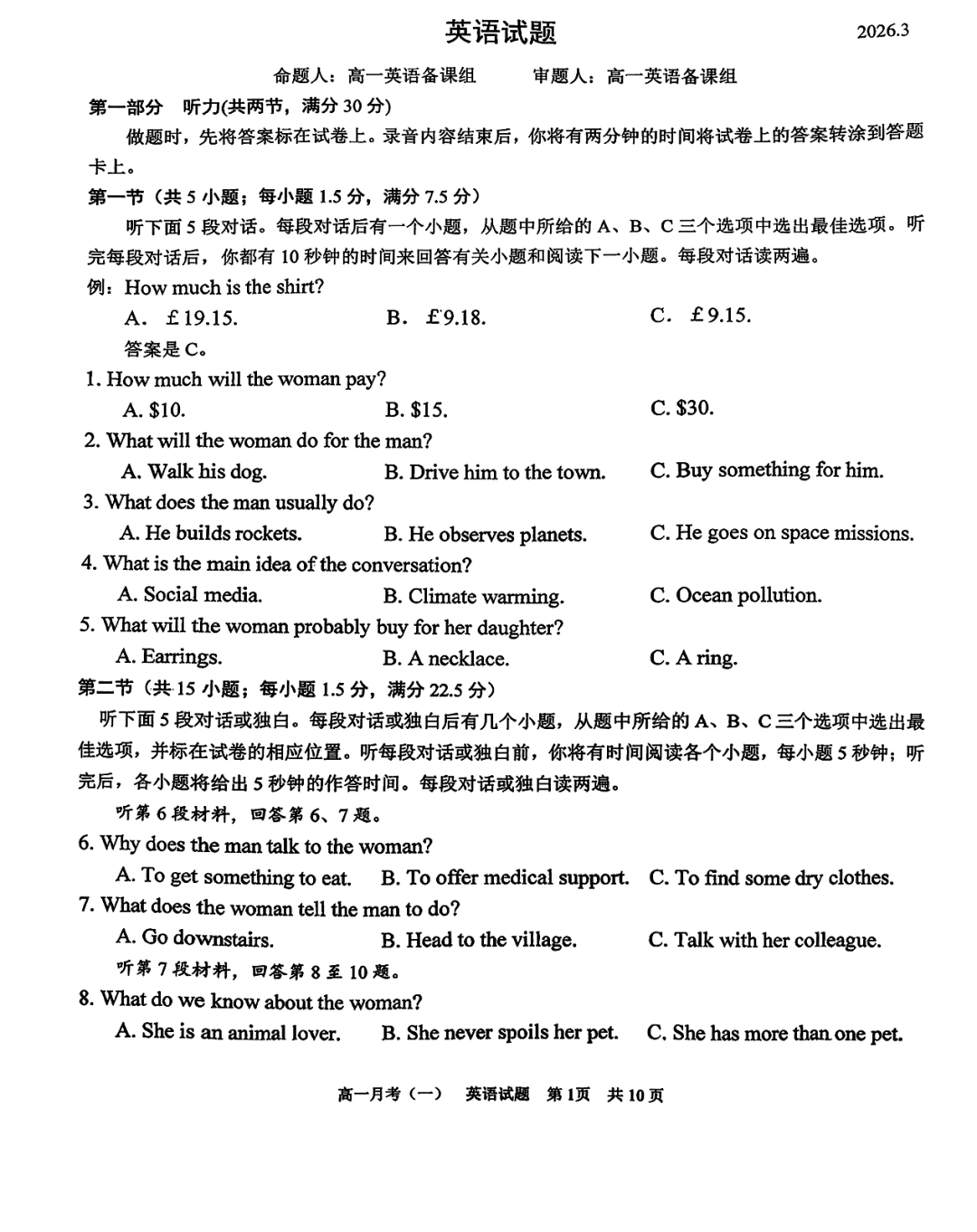 【广西卷】【高一】广西壮族自治区南宁市南宁第三中学2026-2026学年度下学期高一年级月考(一)(3月)(3月底)理科全科试题卷+答案