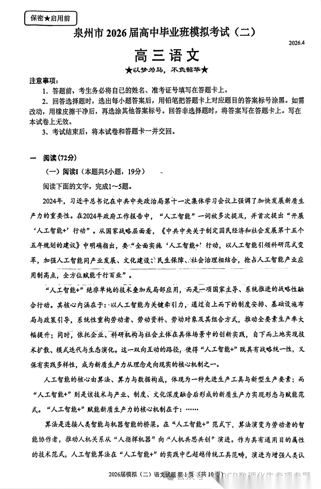 【福建卷】【泉州版】福建省泉州市2026届高中毕业班高三年级模拟考试(二)(泉州二检)(4.8-4.10) 全科试题卷+答案