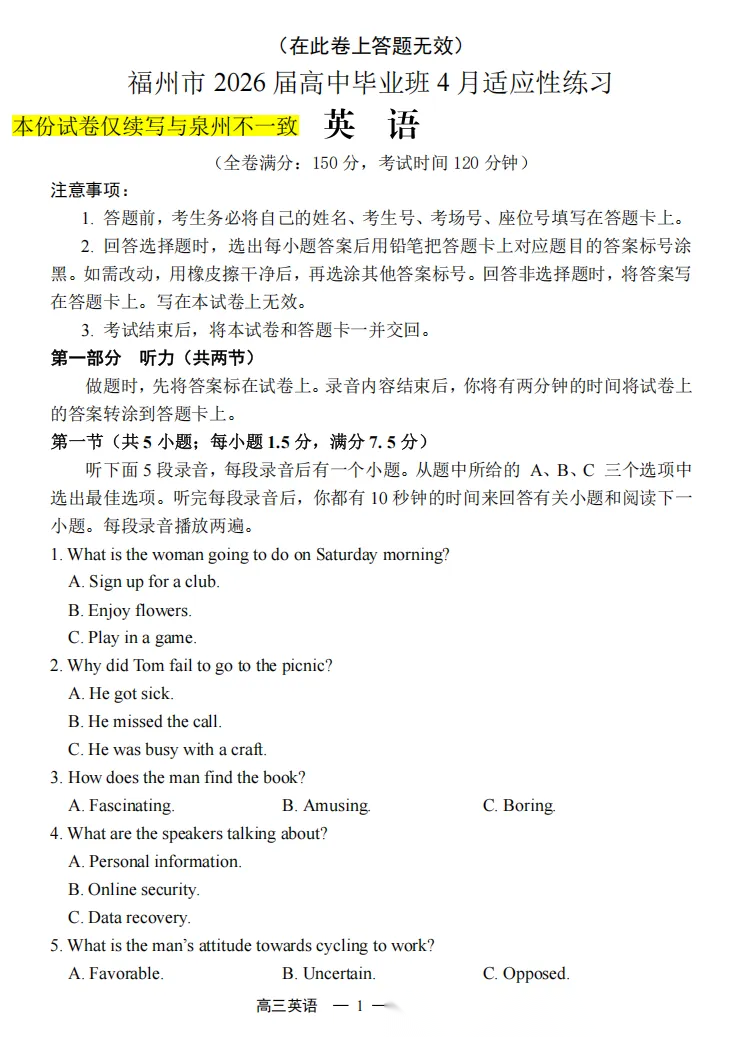 【福建卷】 福建省2026届高中毕业班高三年级4月适应性练习(福建4月质检)(4.8-4.10) 全科试题卷+答题卡+答案 【福建卷】 福建省2026届高中毕业班高三年级4月适应性练习(福建4月质检)(4.8-4.10) 全科试题卷+答...