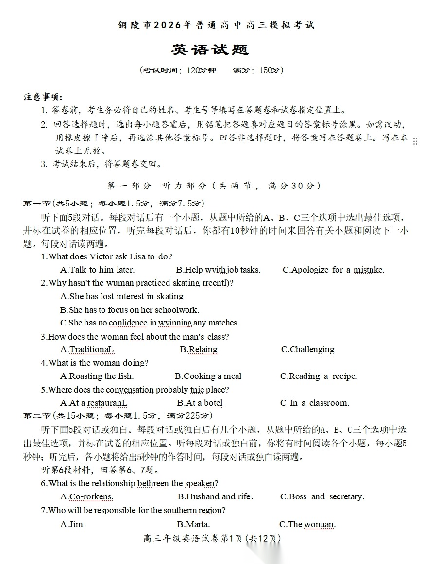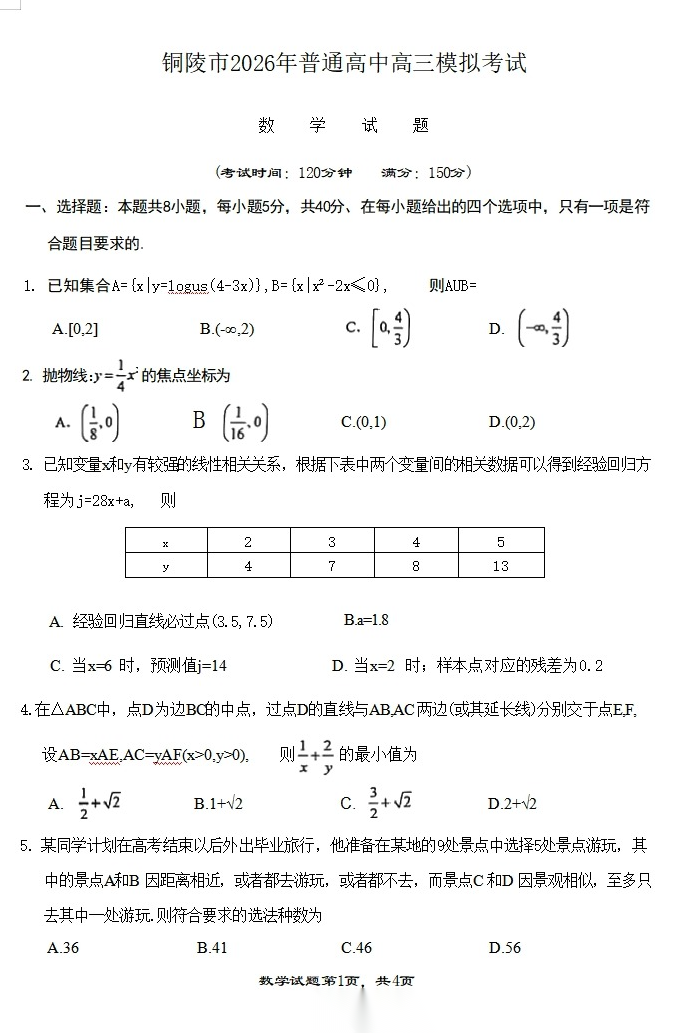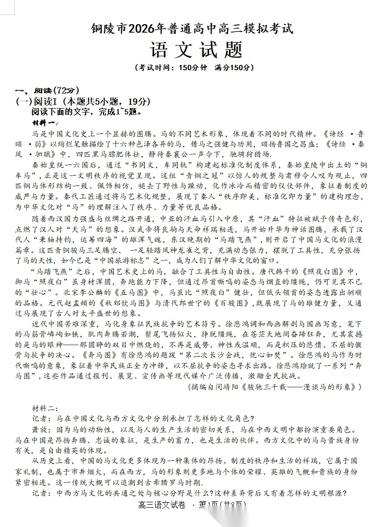 【安徽卷】安徽省铜陵、黄山、宣城三市2026年(届)普通高中高三年级4月份质量检测模拟考试(三市二模)(4.7-4.9)全科试题卷+答案
