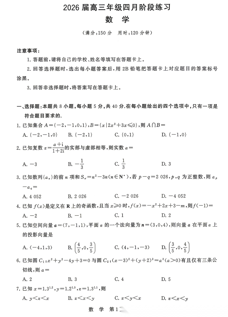 【天津卷】天津市部分区2026年高三年级质量调查试卷(一)(天津一模)(4.9-4.10) 全科试题卷+答案 【天津卷】天津市部分区2026年高三年级质量调查试卷(一)(天津一模)(4.9-4.10) 全科试题卷+答案