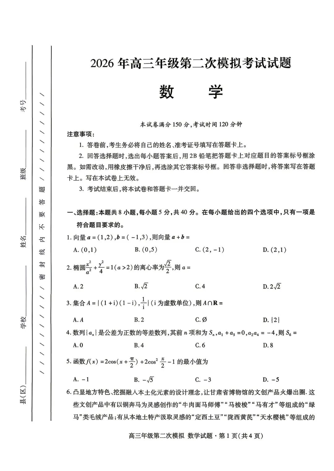 【全科】甘肃省2026年高三年级第二次模拟考试试题