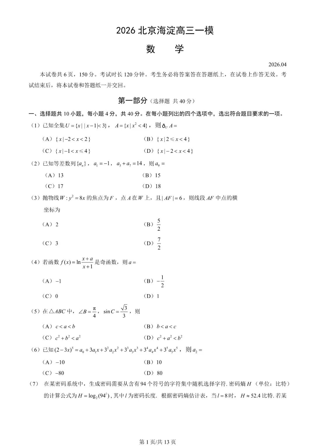 【全科】2026北京海淀区高三一模