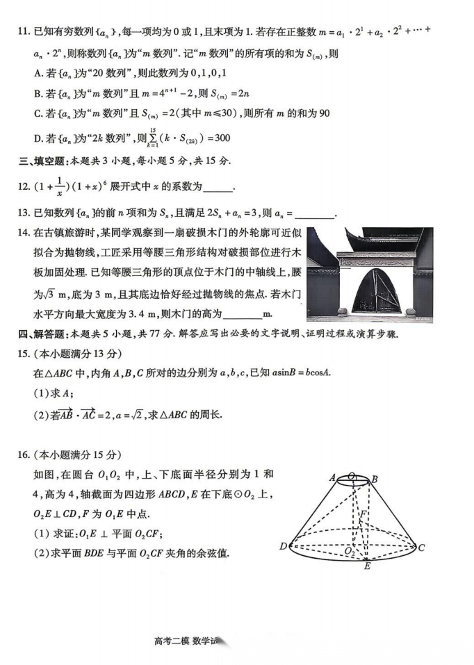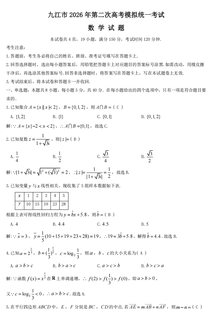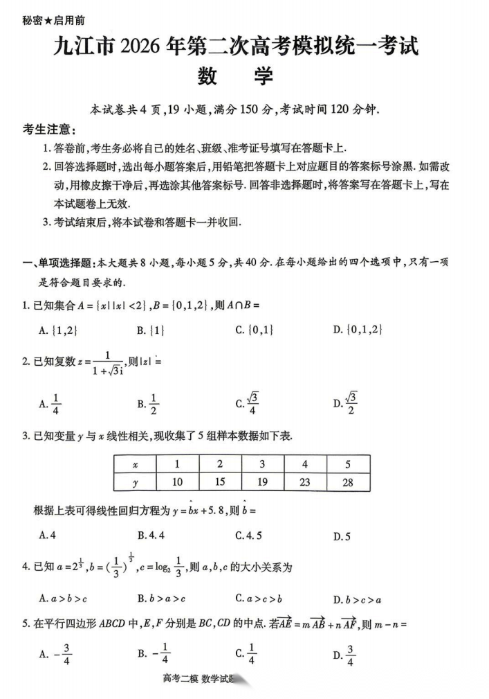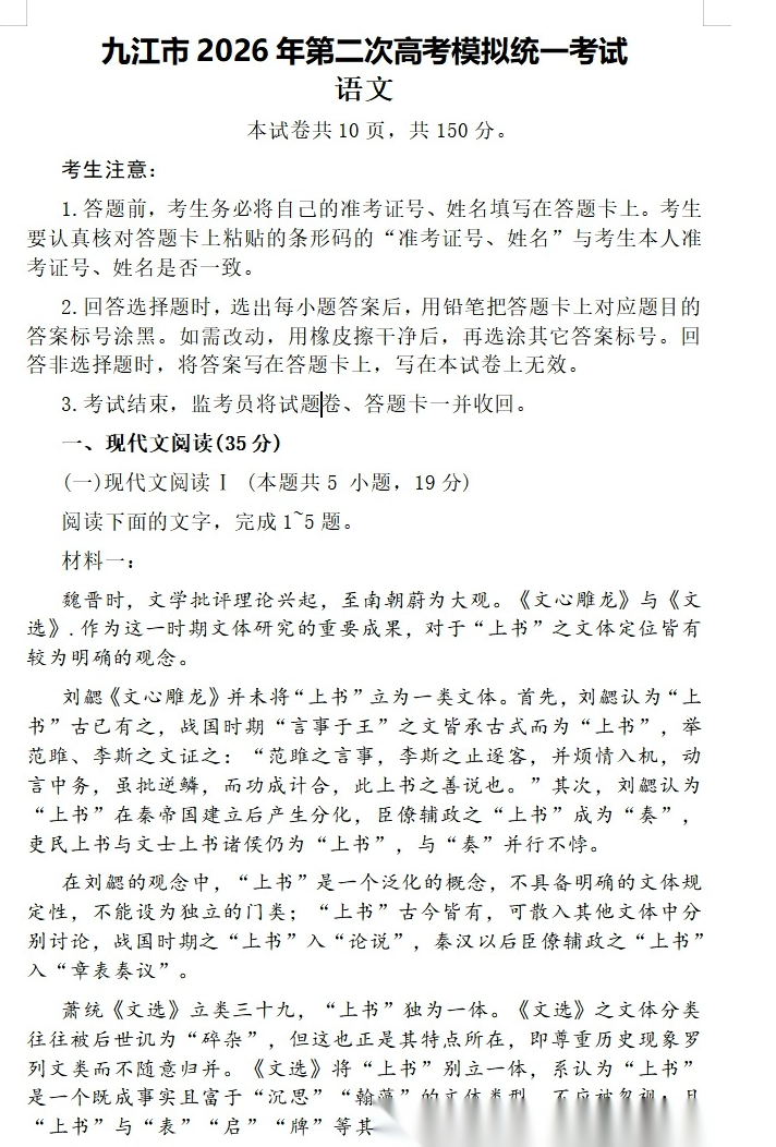 【江西卷】江西省九江市2026年第二次高三年级高考模拟统一考试江西(九江二模)(4.14-416) 数学语文试题卷+答案
