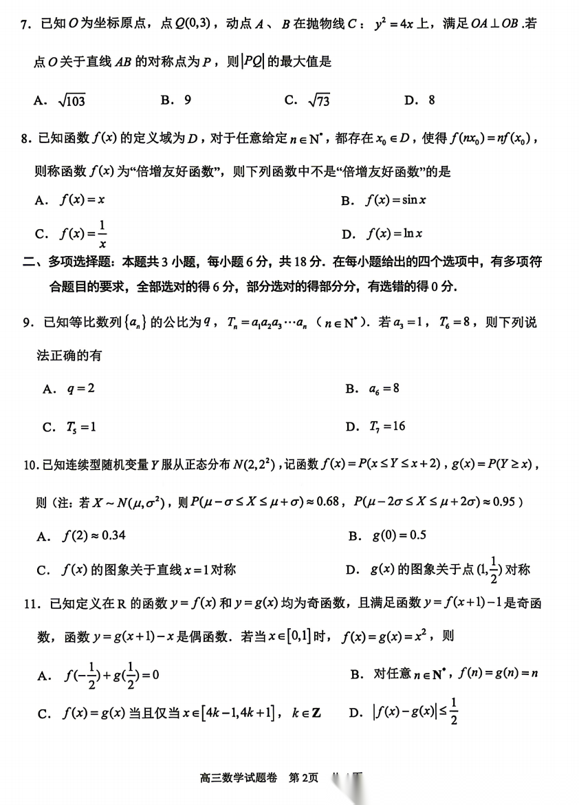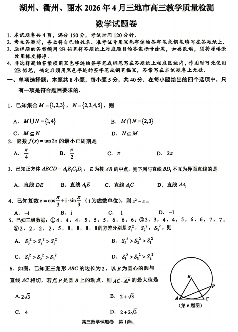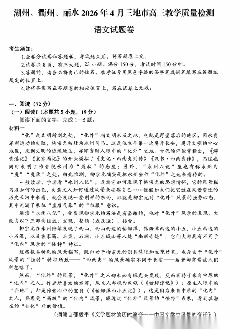 【浙江卷】浙江省湖州、丽水、衢州市2026年4月三地市高三年级教学质量检测(湖丽衢二模)(4.14-4.16) 数学语文试题卷+答案