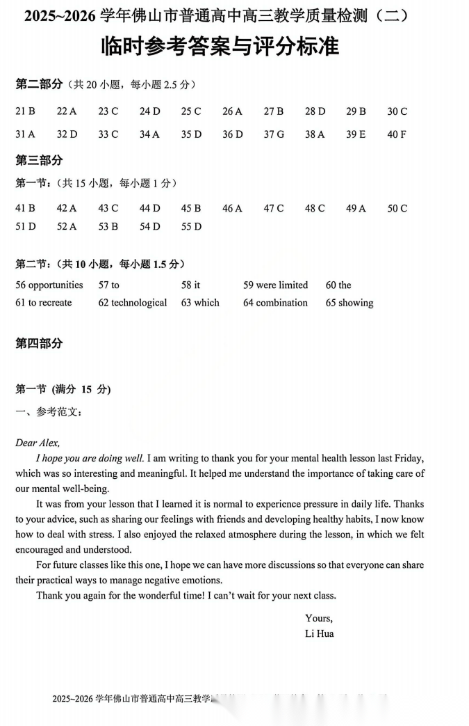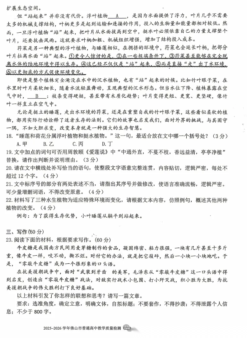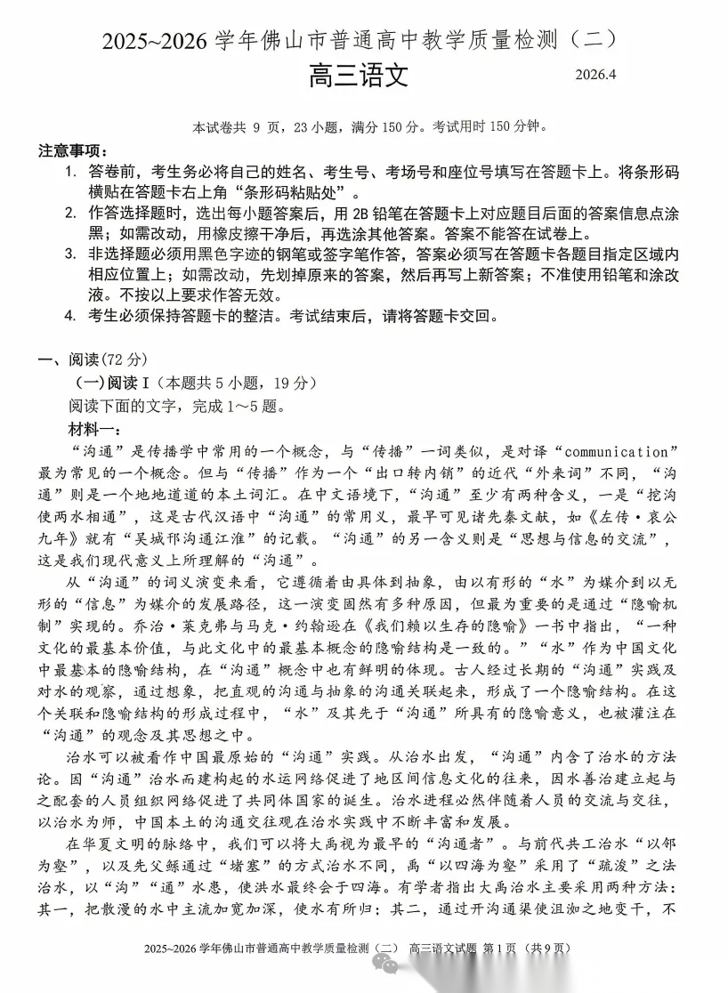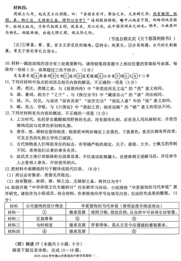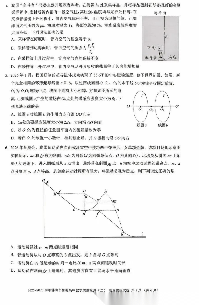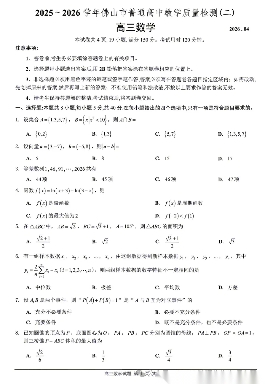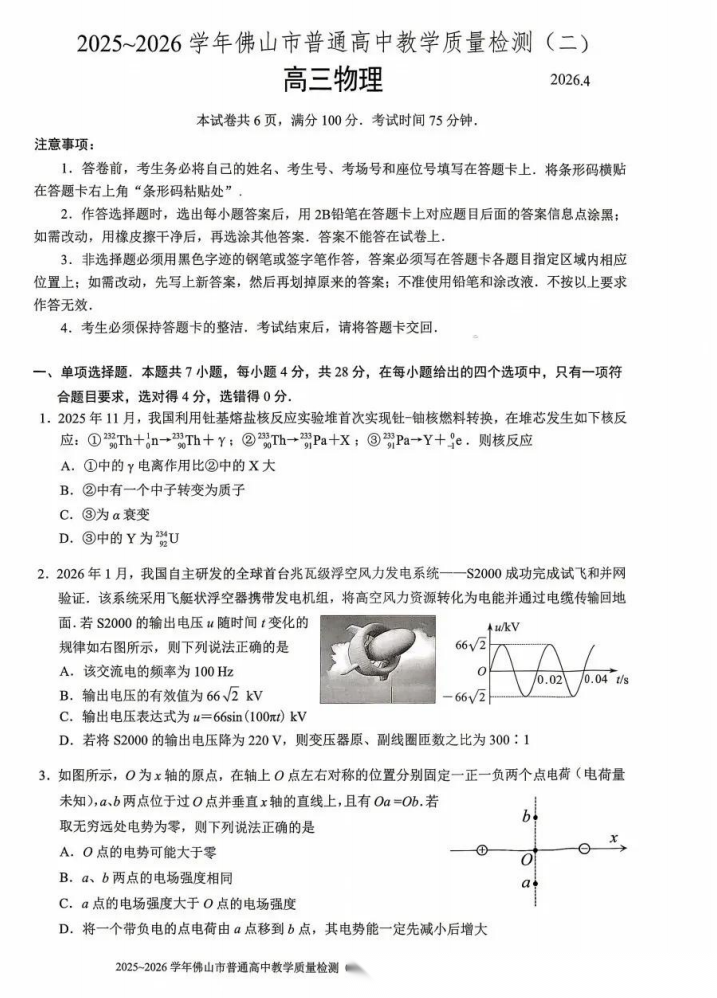 【广东卷】广东省佛山市2025-2026学年佛山市普通高中高三年级教学质量检测(二)(佛山二模)(4.13-4.15) 数学物理英语语文历史试题卷+答案