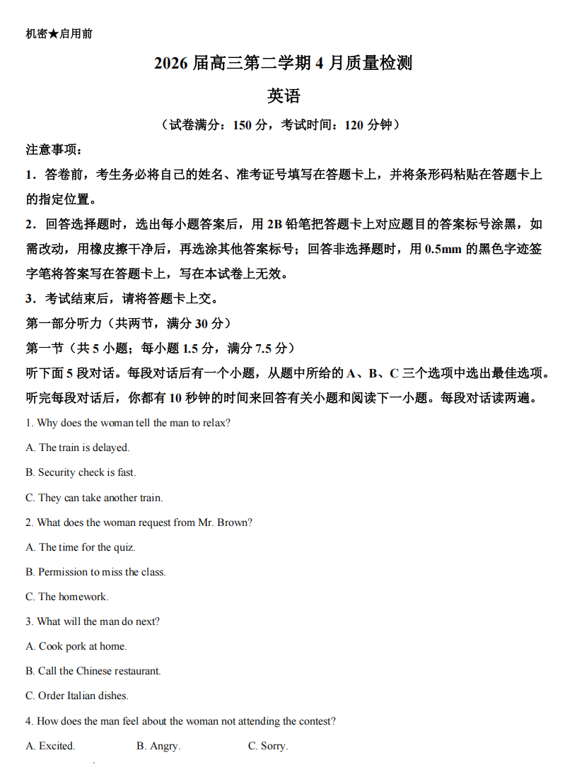 【黑吉辽蒙卷】辽宁省锦州市2026年锦州市普通高中高三年级质量检测(一)(锦州一模)(4.8-4.9) 全科试题卷(缺化学)+答案 【黑吉辽蒙卷】辽宁省锦州市2026年锦州市普通高中高三年级质量检测(一)(锦州一模)(4.8-4.9) 全科试...