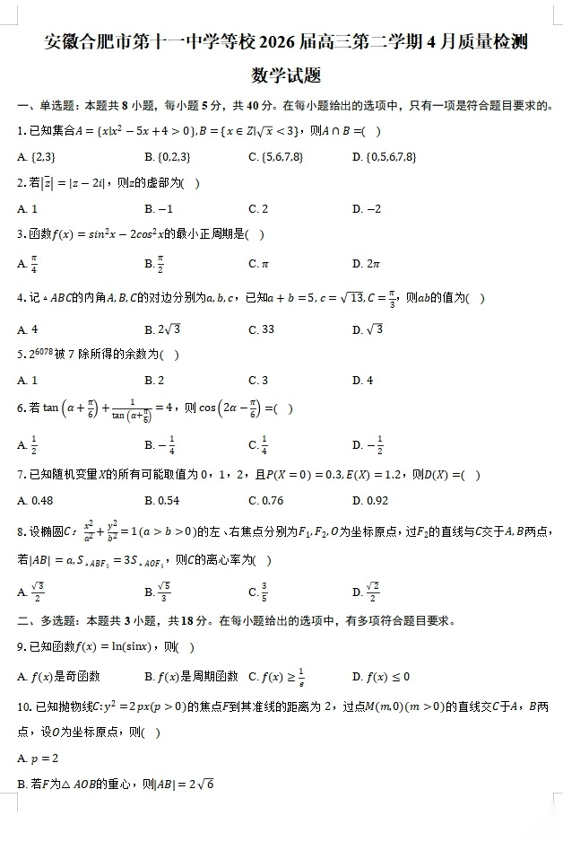 【安徽卷】安徽华师联盟2026届高三年级第二学期4月质量检测(4.9-410) 全科试题卷+答案