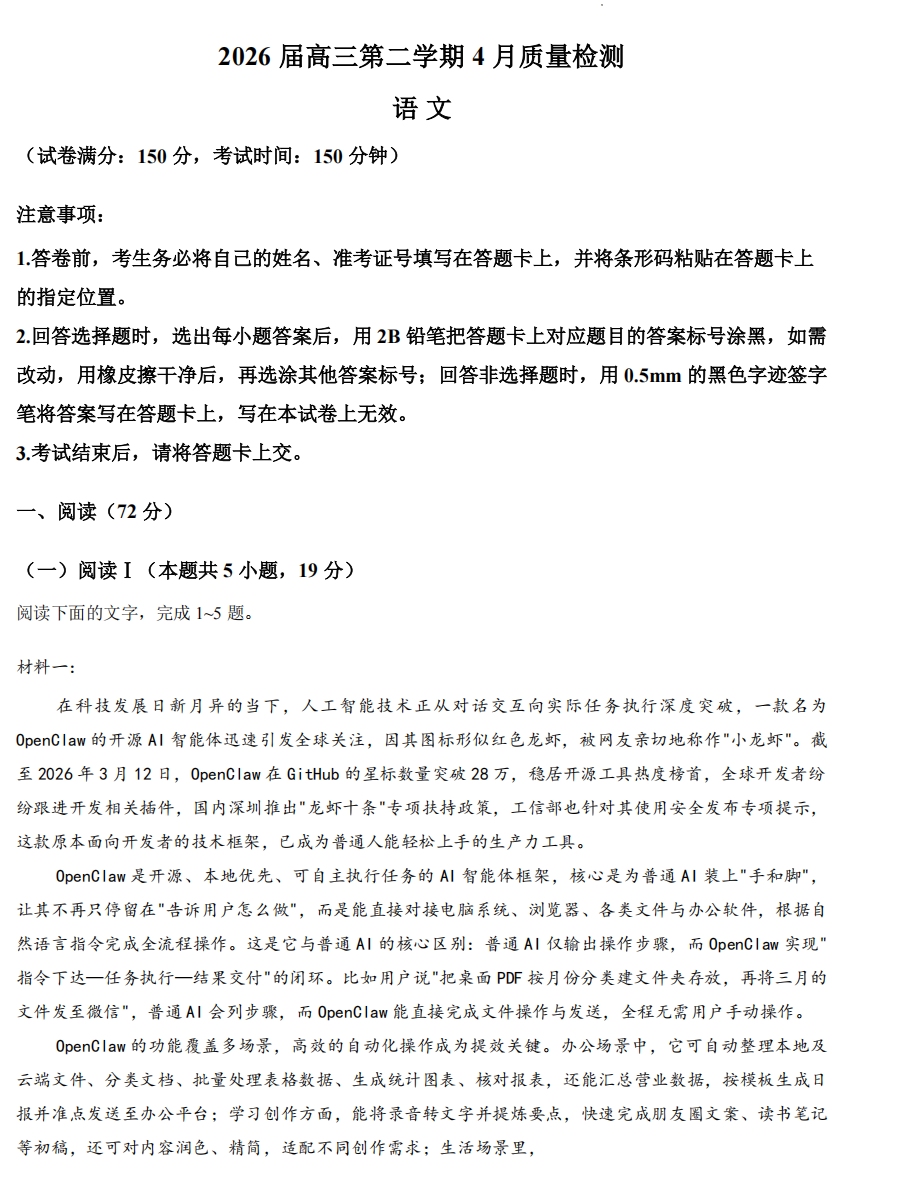 【湖北卷】湖北省新八校2026年4月高三年级4月教学质量教研考试(4.14-4.15) 数学语文试题卷+答案 【湖北卷】湖北省新八校2026年4月高三年级4月教学质量教研考试(4.14-4.15) 数...